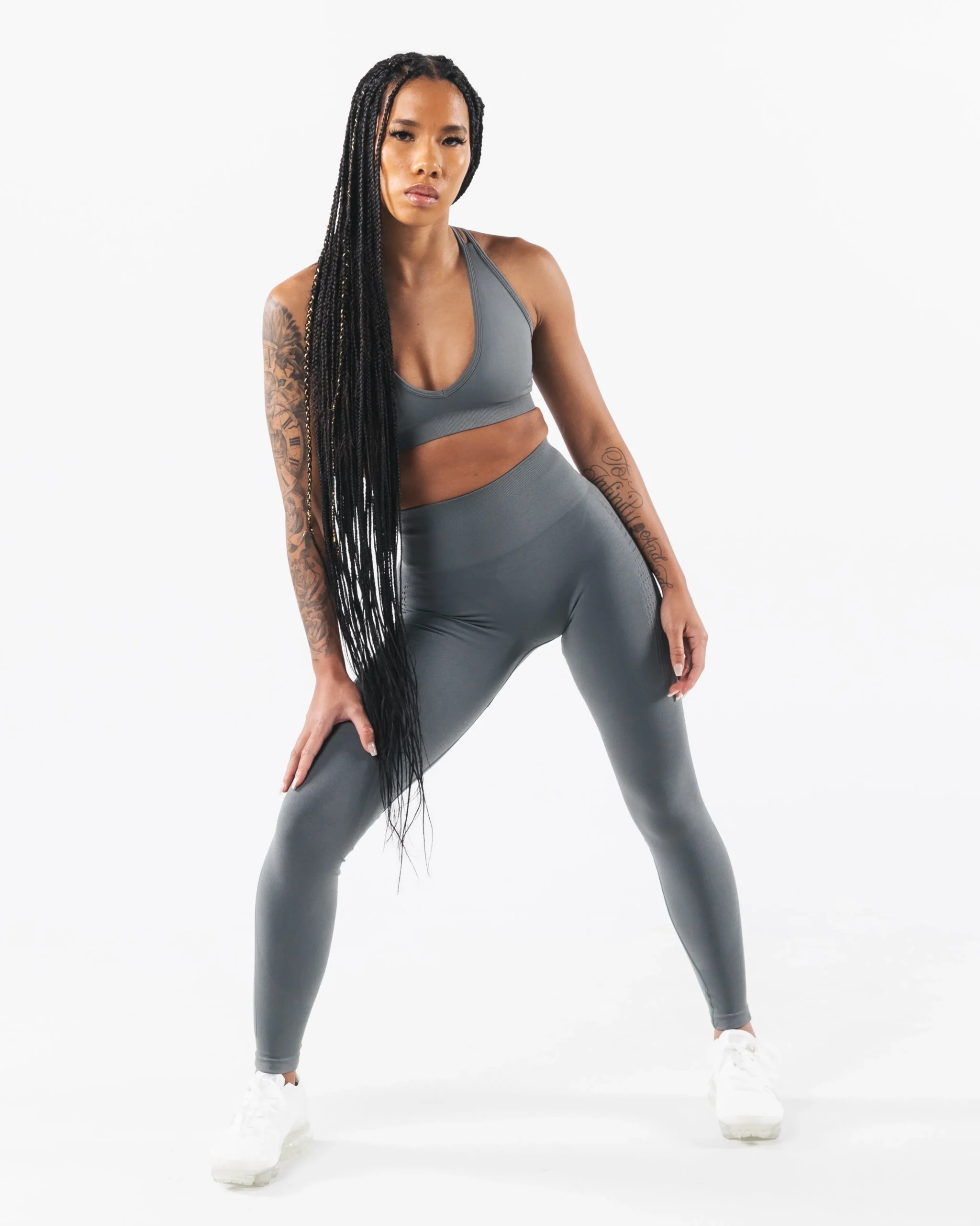 |HIGHLIGHTS|Seamless construction|Rib panel for support|Low to Medium impact|Moisture-wicking breathable fabric|Flattering scoop neckline|FIT SUGGESTION|This itemruns true to Alphalete’s standard seamless fit.|If you are between sizes, we recommend sizing up.|Model is 5’2”/157.5cm, wearing a size XS with a 34.5”/87.6cm bust.|MATERIALS AND WASHING DIRECTIONS|51% Polyamide, 38% Polyester, 11% Elastane|We recommend washing inside-out on a cold setting|Hang to dry|DESCRIPTION|With the beloved Amplify fabric, the new Deep V Bra takes it up a notch. The rib bra band offers support while maintaining a clean seamless finish. Our exclusive seam work and ribbing allows the bra to move with you, while accentuating all of the right places. The new deep V neckline offers a minimal and seamless look. Our original Amplify fabric creates an irresistibly silky, smooth hand-feel, while the full-interlocking knit offers the flexibility to move freely.