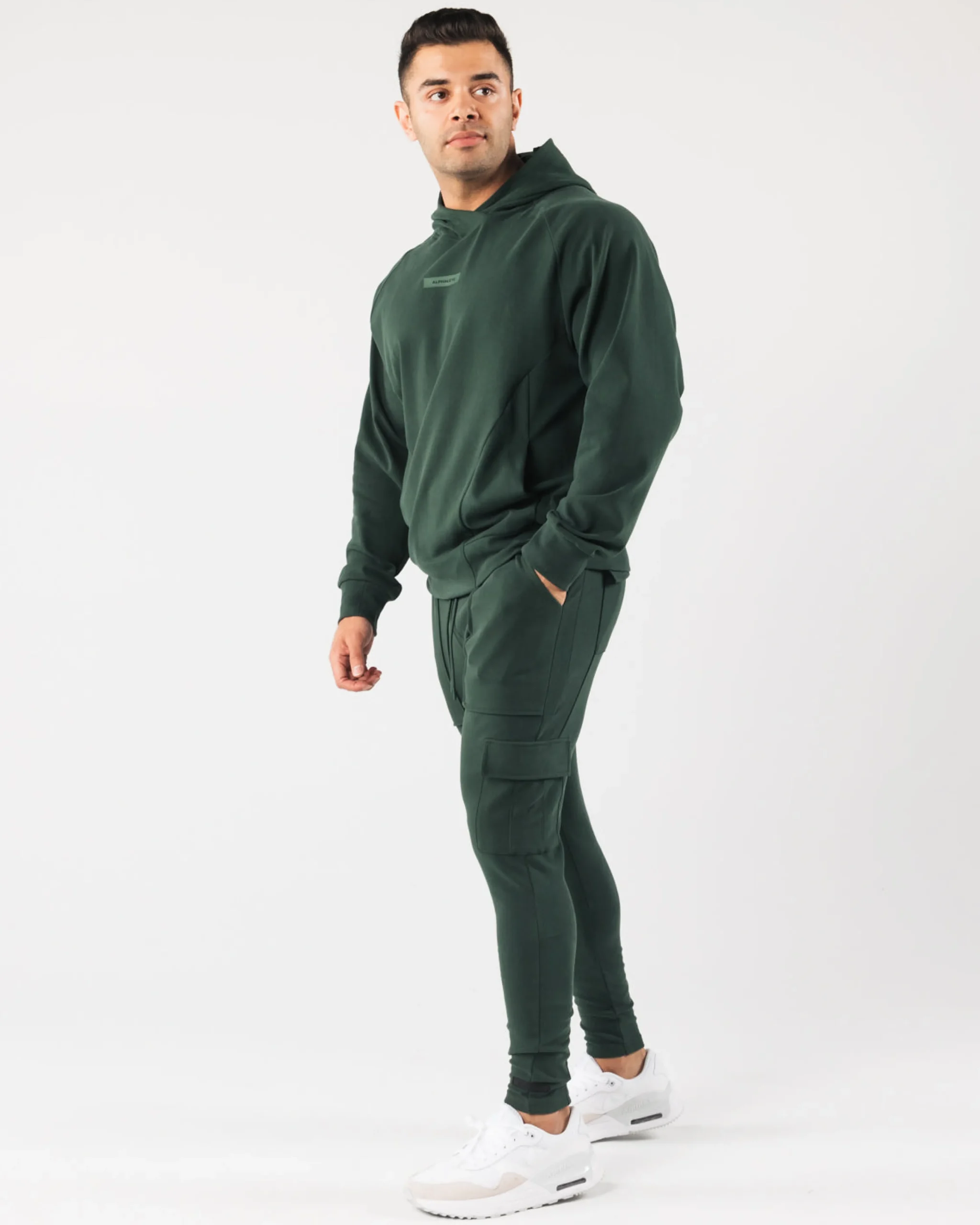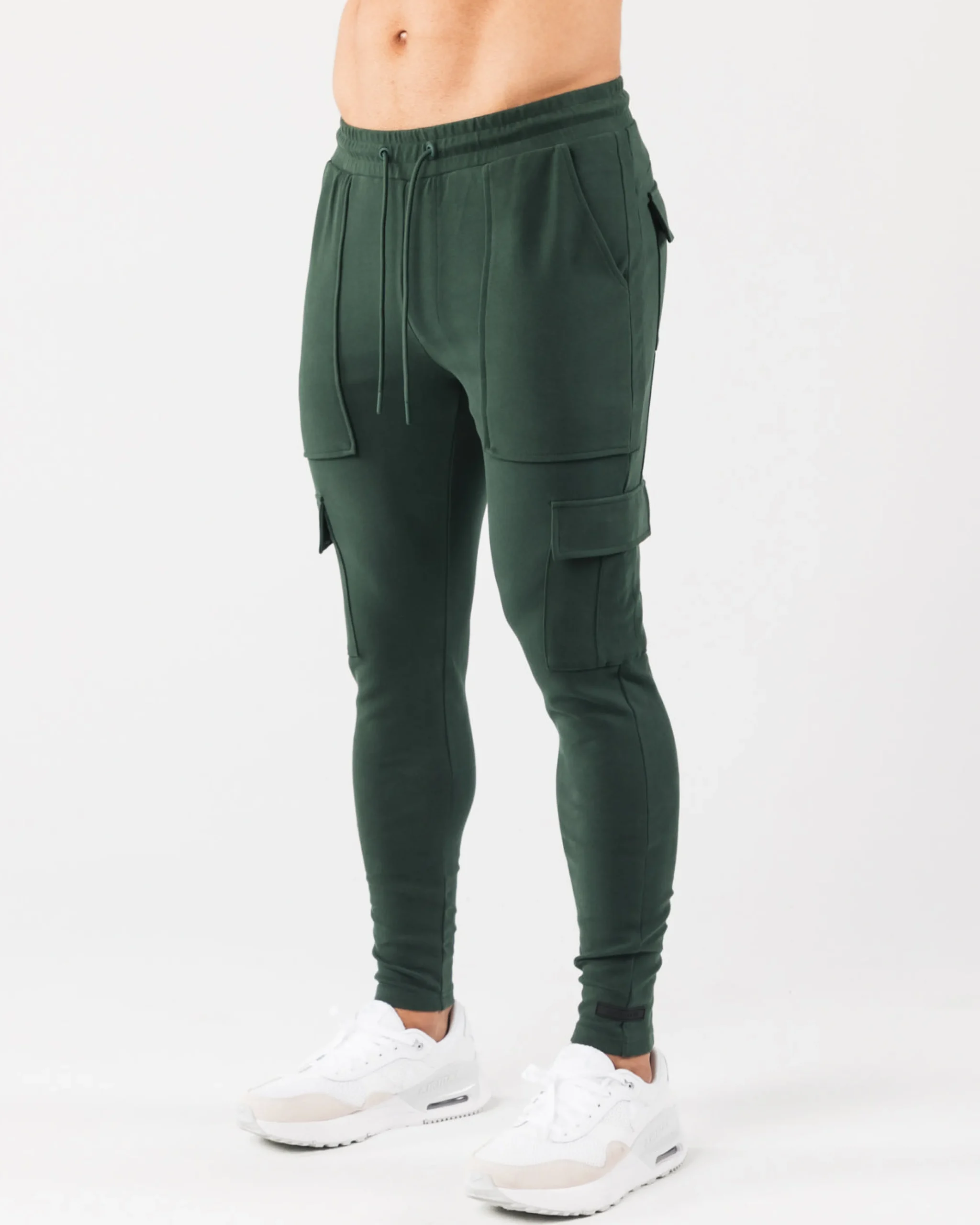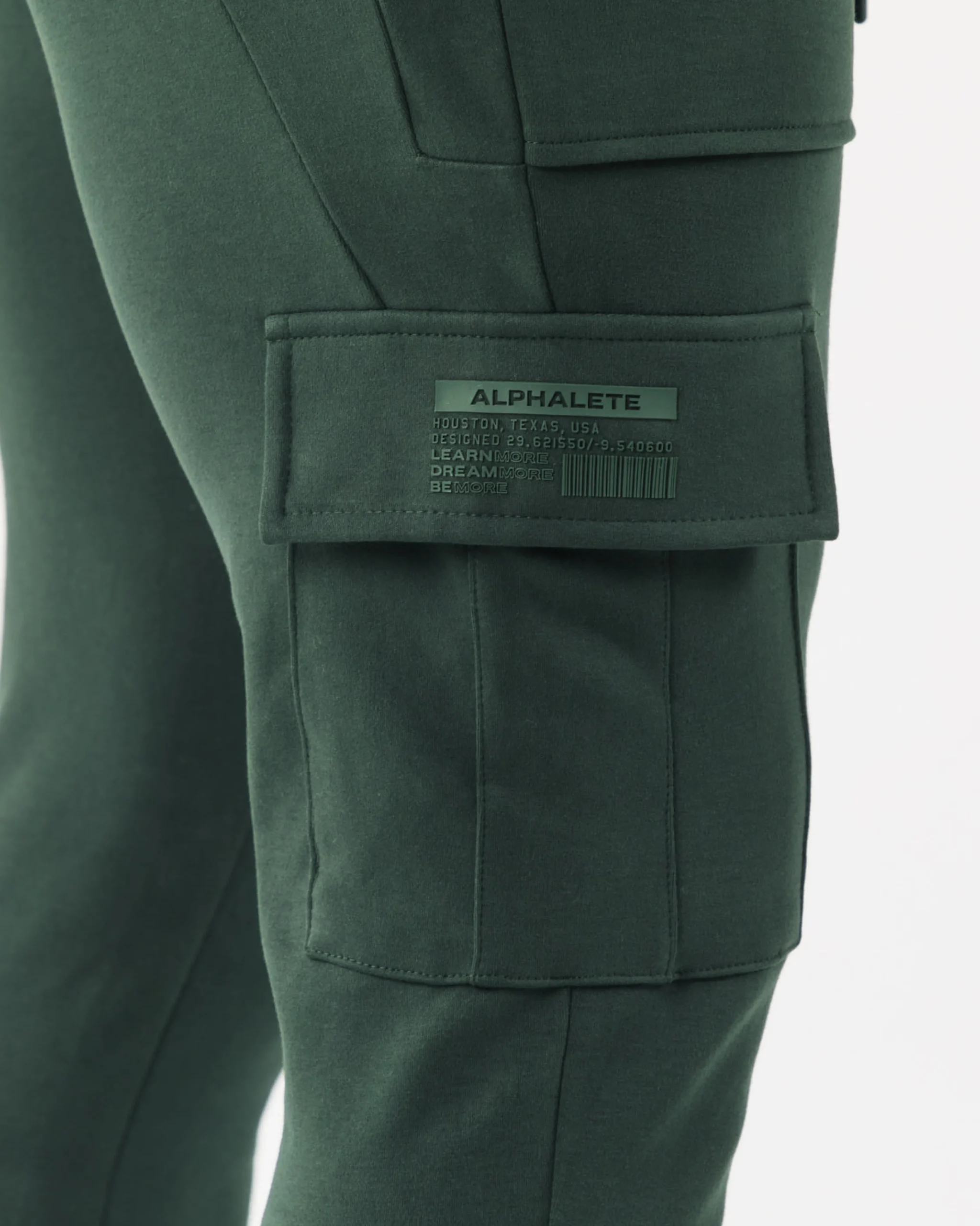 |HIGHLIGHTS|Low-rise jogger with tapered leg fit|Stretchy fabric with a soft brushed surface|Open front pockets|Identity silicone print on right cargo pocket|Dual back and leg pockets with silent velcro closure|Folded seams with faux pleats|Knee dart for structural support|Color-matching drawstrings and trims|Alphalete identity silicone label stitched on left leg|28.5” Inseam|FIT SUGGESTION|This item runs true to Alphalete’s standard fit.|If you are between sizes, we recommend sizing up for a relaxed fit.|Model is 5’10”/177.8cm, wearing a size M with a 34.5”/87.6cm waist.|MATERIALS AND WASHING DIRECTIONS|95% Cotton, 5% Elastane|We recommend washing inside-out on a cold setting|Hang to dry|Our Identity Collection offers Luxurious, brushed surface with an added silicone wash gives a plush and velvety hand-feel. All Identity piece are made with 4-way stretch fabric, offering both superior shape retention and warmth. This range was designed to increase internal comfort, without sacrificing aesthetics. This collection packs physique enhancing, confidence inducing seam work that is able to withstand intense activity through structurally supportive darts and panels. The Identity collection uses only the highest quality of infused, silicone branding that delivers state-of-art, water resistant technology and is incredibly durable. Identity outerwear offers a relaxed fit for the ideal lounge look, while identity bottoms feature expert teeing for a fitted, sporty look.