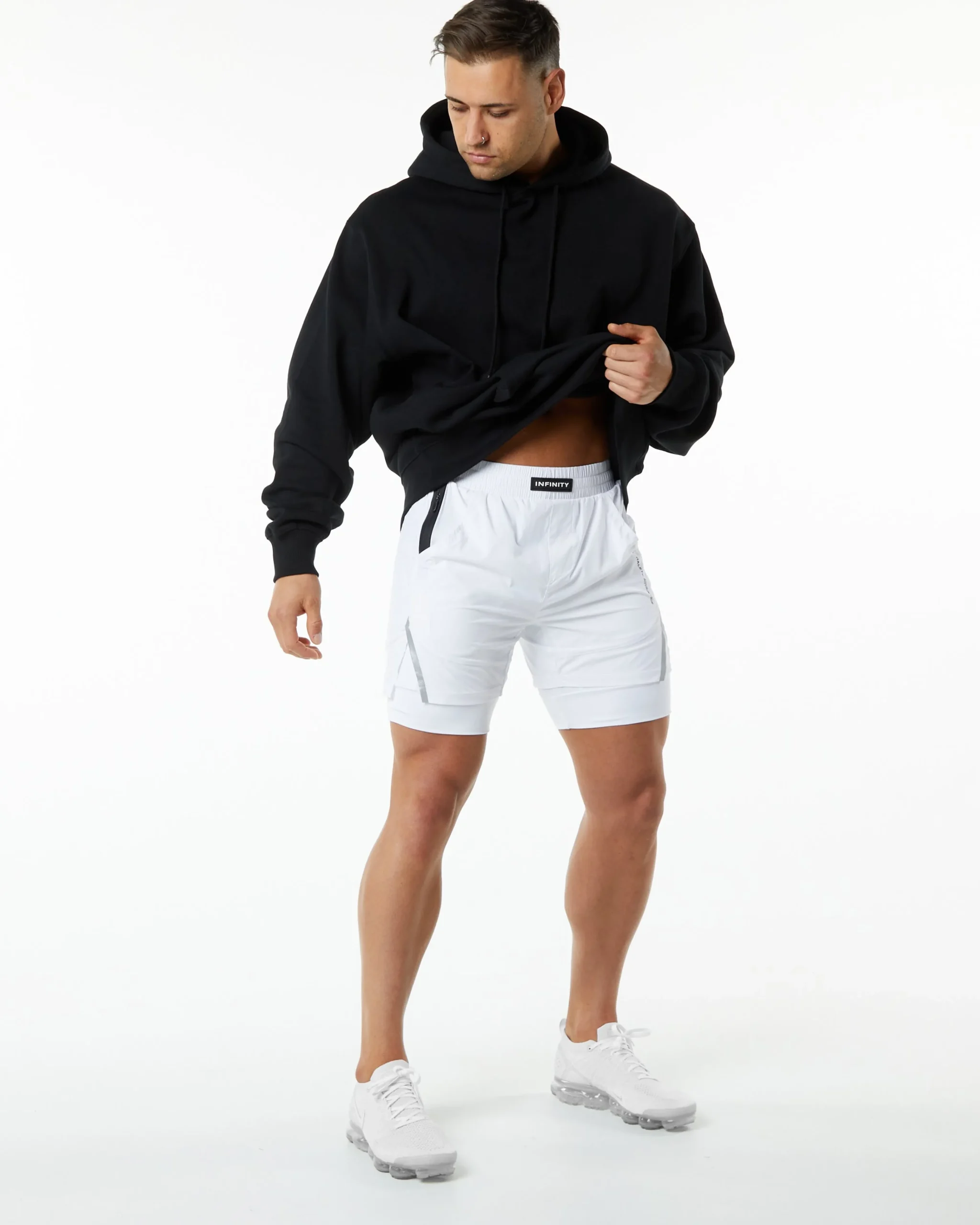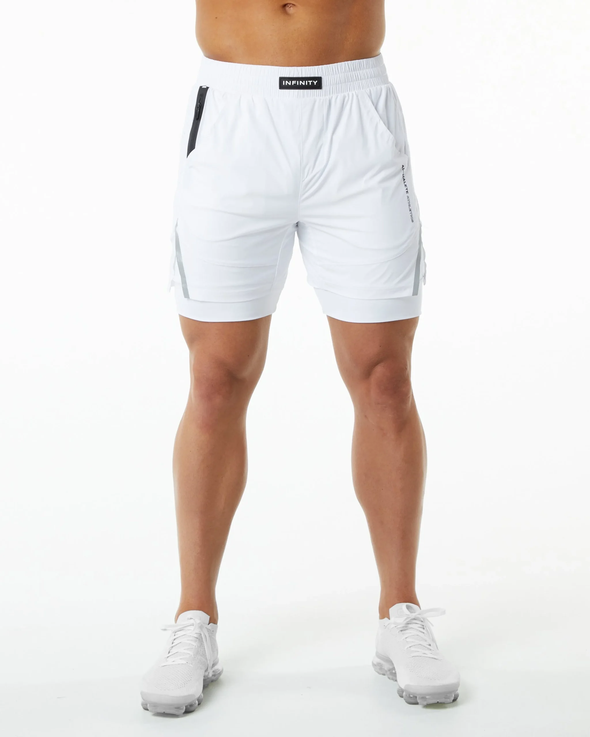 |HIGHLIGHTS|Woven, compression-lined short|5.5” Inseam|Front slip pockets|Size Up, if you don’t like compressive fit|Runs small, consider sizing up|Upgraded smoother and softer Infinity fabric|Waterproof zipper on the right side with YKK zippers|Laser cut perforations for breathability|Custom branded flat profile drawstrings|Alphalete Infinity logo in premium silicone|Alphalete Athletic logo printed on left thigh|FIT SUGGESTION|This item runs true to Alphalete’s standard sizing.|If you are between sizes, we recommend sizing up for a relaxed fit.|Model is 6’0”/183cm, wearing a size L with a 32”/81cm waist.|MATERIALS AND WASHING DIRECTIONS|80% Nylon, 20% Elastane|We recommend washing inside-out on a cold setting|Hang to dry|DESCRIPTION|Designed for technical performance and recreation, the Infinity Collection offers a range of products guaranteed to take you through your toughest workouts. Alphalete understands the close synergy between garment and textile, which is why all infinity fabrics are expertly selected to provide superior sports performance. Alphalete Infinity speaks to those who demand the most out of life and have similar demands of their apparel. The Infinity Collection offers everything you’ll need to build the ultimate sports performance wardrobe. The range offers a wide selection of woven bottoms, knitted tops and compact all-conditions outerwear. Since day one, Alphalete has been leading the race to create the best sports performance wear on the market, consider this our victory lap.