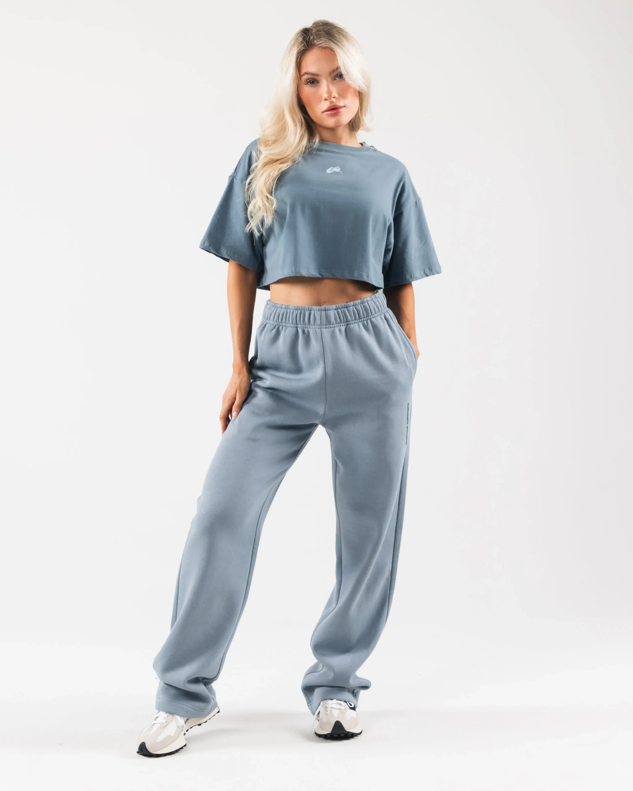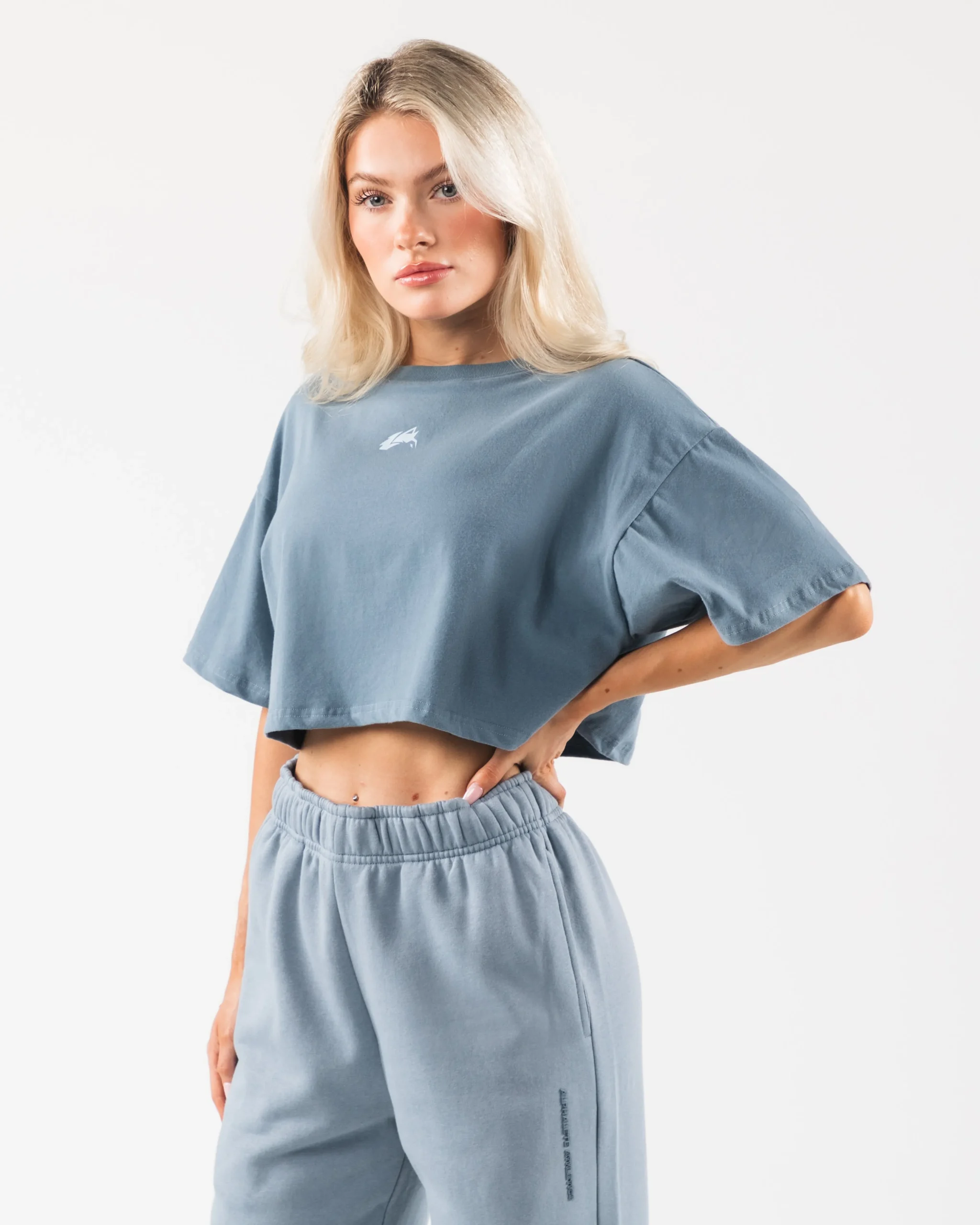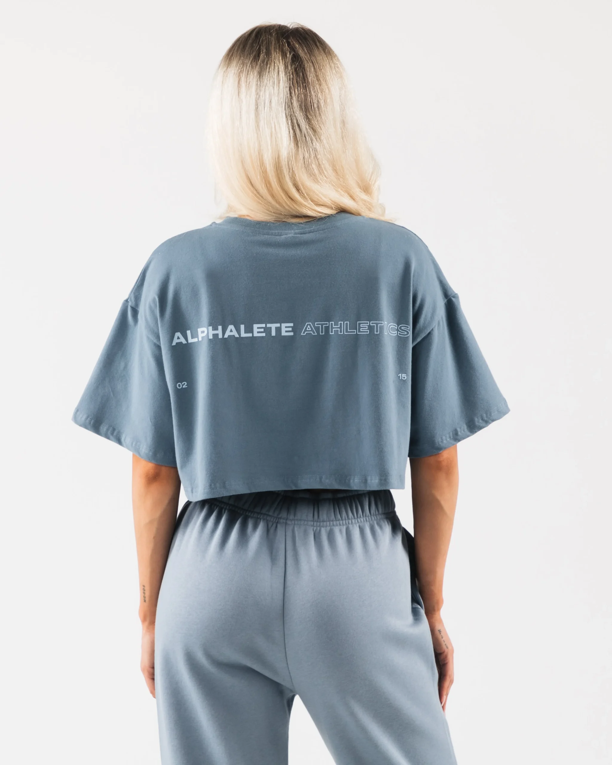 |HIGHLIGHTS|Relaxed fit|Cropped|Lightweight u0026amp; flexible|FIT SUGGESTION|This item runs true to Alphalete’s standard fit.|Model is 5’2”/157.5cm, wearing a size S with a 34”/86.4cm bust.|MATERIALS AND WASHING DIRECTIONS|95%Cotton,5%Spandex|We recommend washing inside-out on a cold setting|Hang to dry|DESCRIPTION|The perfect merge of style and performance, this tee is durable and comfortable. The Origin Crop Tee features our signature wolf head and Alphalete Athletics logo. Mix and match with out collection for the perfect workout outfit.