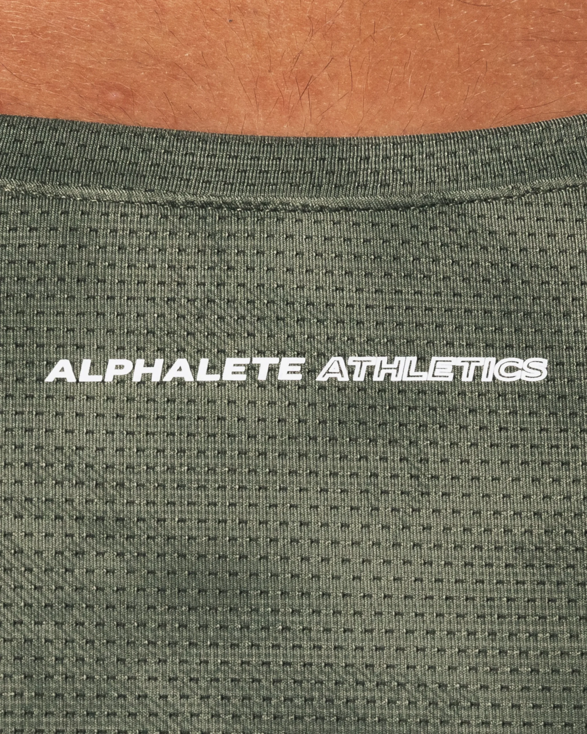 |HIGHLIGHTS|Bonded finish at hem|Lightweight and breathable mesh knit fabric|Four way stretch|Zip placket with notched collar|Logo aplique at back neck|FIT SUGGESTION|This item has a slim fit.|Narrower cut, tapered waist, fitted appearance.|Jammal is6’0”/183cm, wearing a size XL with a 51”/130cm chest.|MATERIALS AND WASHING DIRECTIONS|84% Nylon, 16% Elastane|Comfort|Lightweight|Four way stretch|Breathability|Cold wash|Do not iron|Do not tumble dry|Do not bleach|Inspired by running Alphalete distills the fundamentals of form, function and comfort for optimal movability. The racer tank top is constructed from a lightweight mesh fabric which offers breathability and flexibility. A bonded hem and a four way stretch fabric offers movement without restriction to serve you on your fitness journey.|