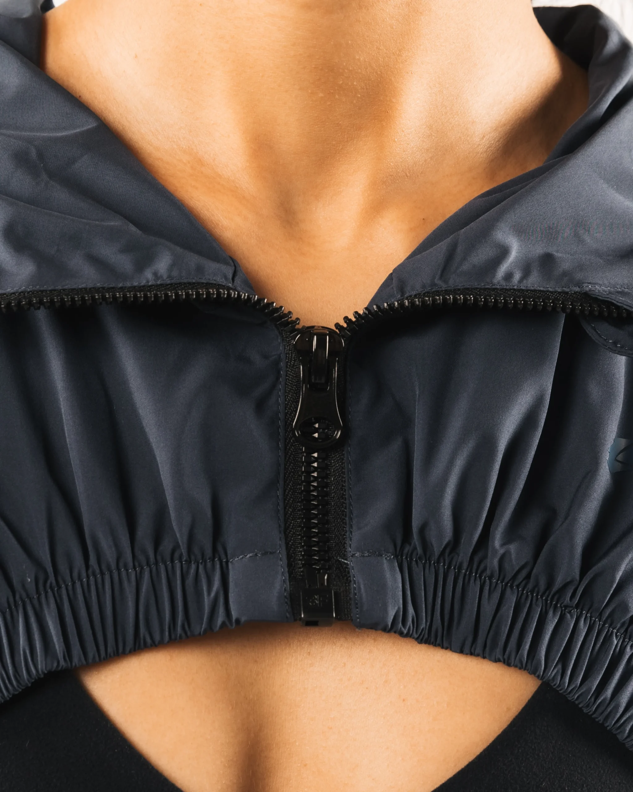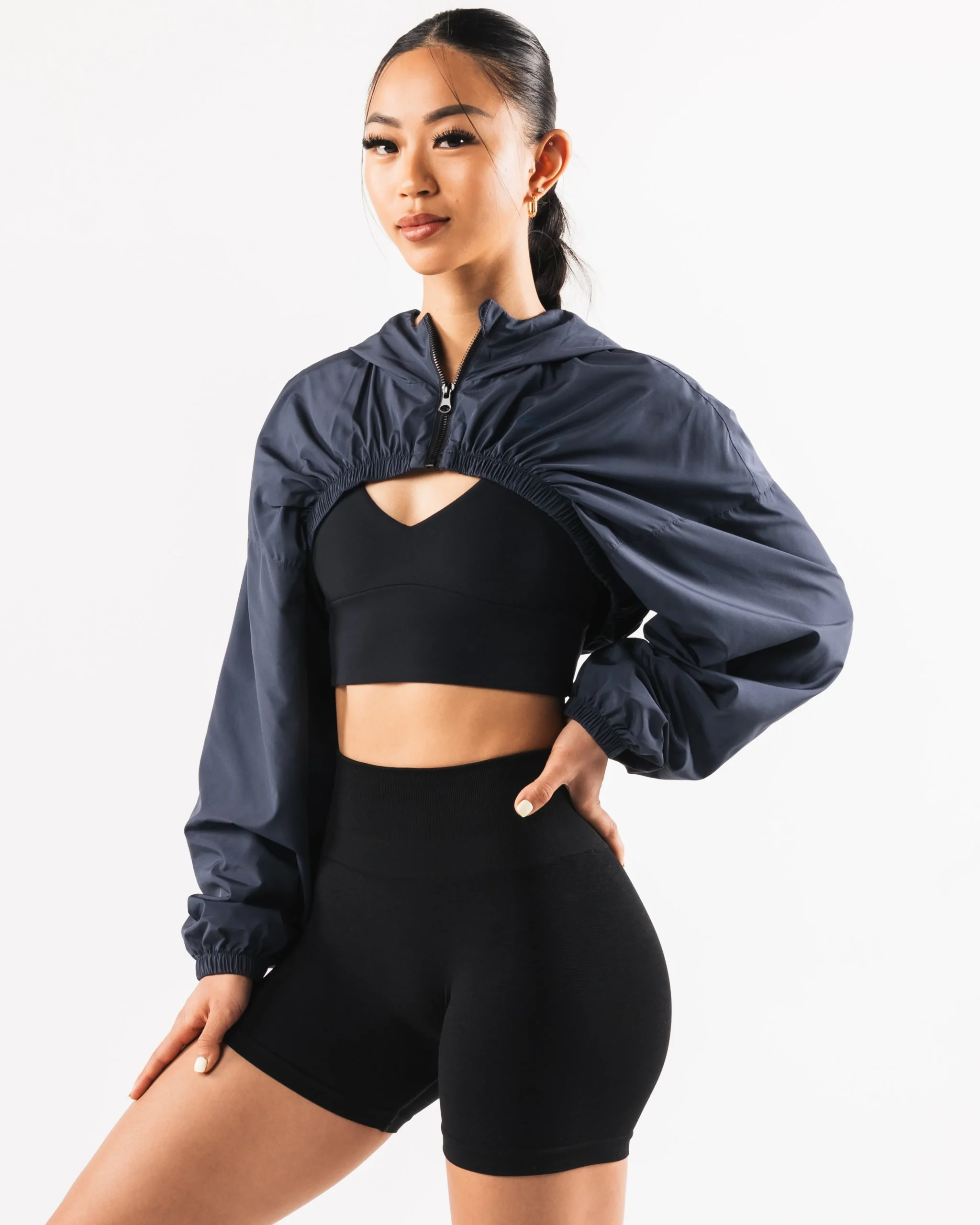 HIGHLIGHTS|Woven fabric|Long sleeve|Alphalete wolf logo|FIT SUGGESTION|This itemruns true to Alphalete’s standard size.|Jessica is 5’3”/160cm, wearing a size XS with a 30”/77.5cm bust.|MATERIALS AND WASHING DIRECTIONS|100% Polyester|We recommend washing inside-out on a cold setting|Hang to dry|DESCRIPTION|With a silky smooth woven fabric, this jacket is perfect for wearing to and from the gym or during a cold outdoor workout for some added warmth. The wide sleeves and gathered hem make for the perfect oversized laidback look, the high crop makes this the perfect piece to layer over your favorite Alphalete bras and tops.|
