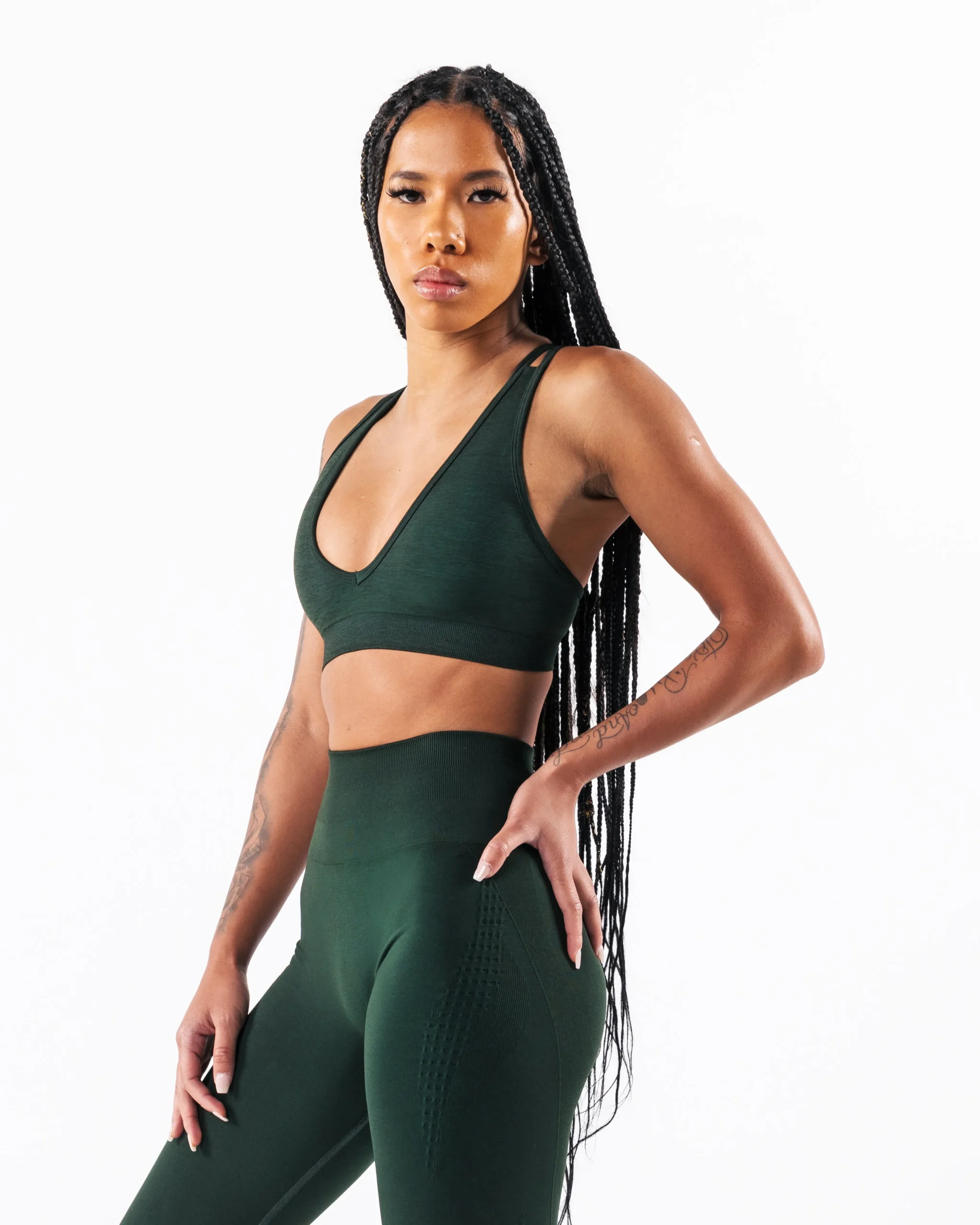 |HIGHLIGHTS|Seamless construction|Rib panel for support|Low to Medium impact|Moisture-wicking breathable fabric|Flattering scoop neckline|FIT SUGGESTION|This itemruns true to Alphalete’s standard seamless fit.|If you are between sizes, we recommend sizing up.|Model is 5’2”/157.5cm, wearing a size XS with a 34.5”/87.6cm bust.|MATERIALS AND WASHING DIRECTIONS|51% Polyamide, 38% Polyester, 11% Elastane|We recommend washing inside-out on a cold setting|Hang to dry|DESCRIPTION|With the beloved Amplify fabric, the new Deep V Bra takes it up a notch. The rib bra band offers support while maintaining a clean seamless finish. Our exclusive seam work and ribbing allows the bra to move with you, while accentuating all of the right places. The new deep V neckline offers a minimal and seamless look. Our original Amplify fabric creates an irresistibly silky, smooth hand-feel, while the full-interlocking knit offers the flexibility to move freely.