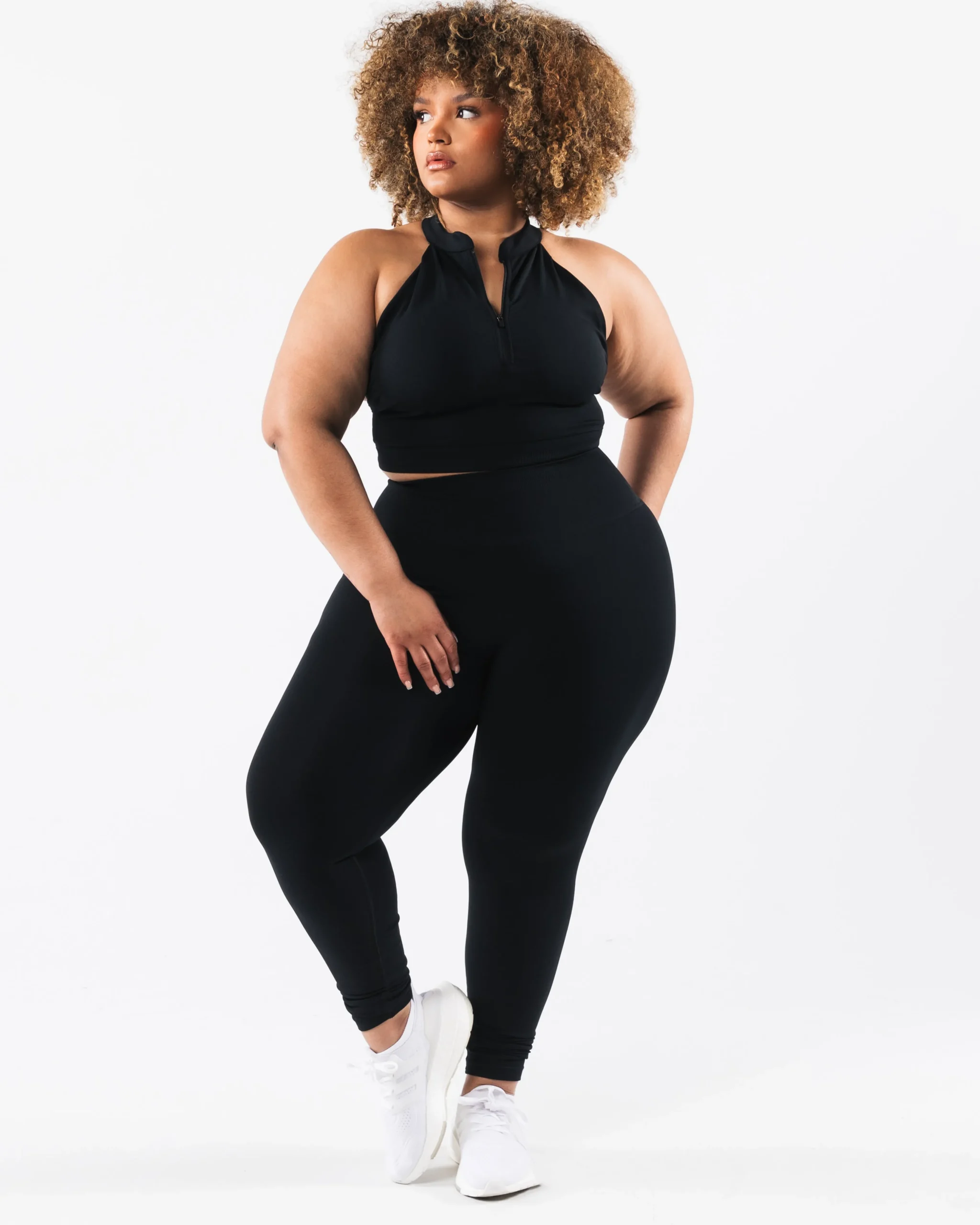 HIGHLIGHTS|Seamless knit|25″ inseam|High compression waistband|Stitched core wordmark logo|FIT SUGGESTION|This itemruns true to Alphalete’s standard seamless fit.|We recommend sizing up for a comfortable fit.|Amanda is 5’10”/177.8cm, wearing a size S with 40″/101.6cm hips and 28”/71.1cm waist.|Brizza is 5’2″/157.5cm, wearing a size XL with 49.5″/125.7cm hips and 35″/88.9cm waist.|MATERIALS AND WASHING DIRECTIONS|51% Polyamide, 38% Polyester, 11% Elastane|We recommend washing inside-out on a cold setting|Hang to dry|DESCRIPTION|A custom blend of yarn fibers creates an irresistibly silky, smooth hand-feel. Our full-interlock knit construction forms a more dense seamless fabric that maintains breathability. Increased elasticity provides unmatched compression, shape retention, and flexibility, made to move in sync with the body. The physique-enhancing rib paneling provides ideal support and durability. Amplify bottoms are designed to accentuate curves in all the right places.