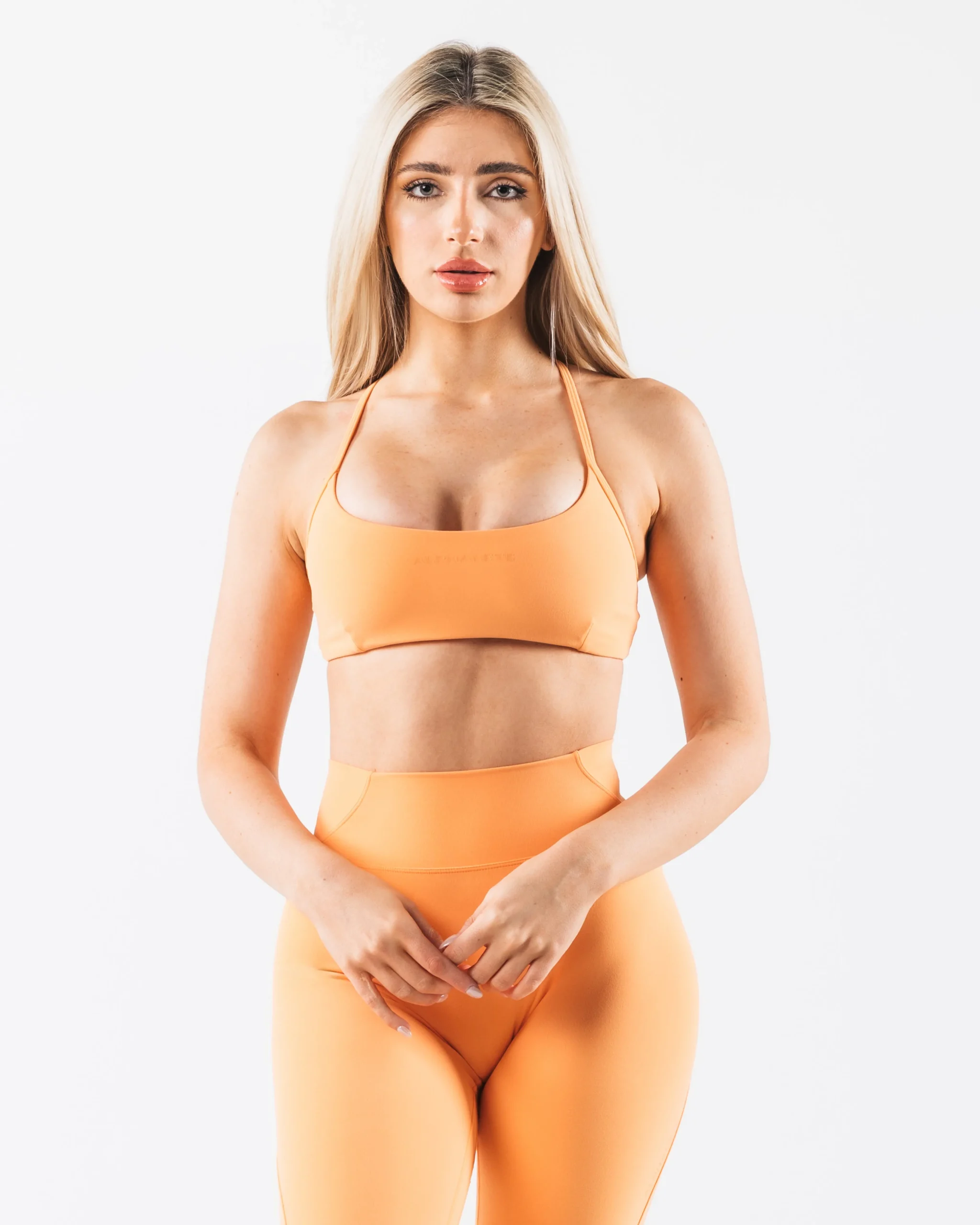 |HIGHLIGHTS|Flattering cut|Buttery soft hand feel|High Stretch|Open strappy back design|A/B cup size|FIT SUGGESTION|This item runs true to Alphalete’s standard size.|If you are between sizes, we recommend sizing up.|Model is 5’7”/170cm, wearing a size XS with a 33.5”/85cm bust.|MATERIALS AND WASHING DIRECTIONS|75% Nylon, 25% Spandex|We recommend washing inside-out on a cold setting|Hang to dry|DESCRIPTION|Discover a fusion of supreme comfort and high-stretch compression with our new Aura fabric. Made with irresistibly soft, brushed fabric, ourbrasoffer you unrestricted movement whether you’re headed to the gym, a yoga class, or simply lounging at home. Thestrappy open backand flattering cut hug and enhance all the right places.