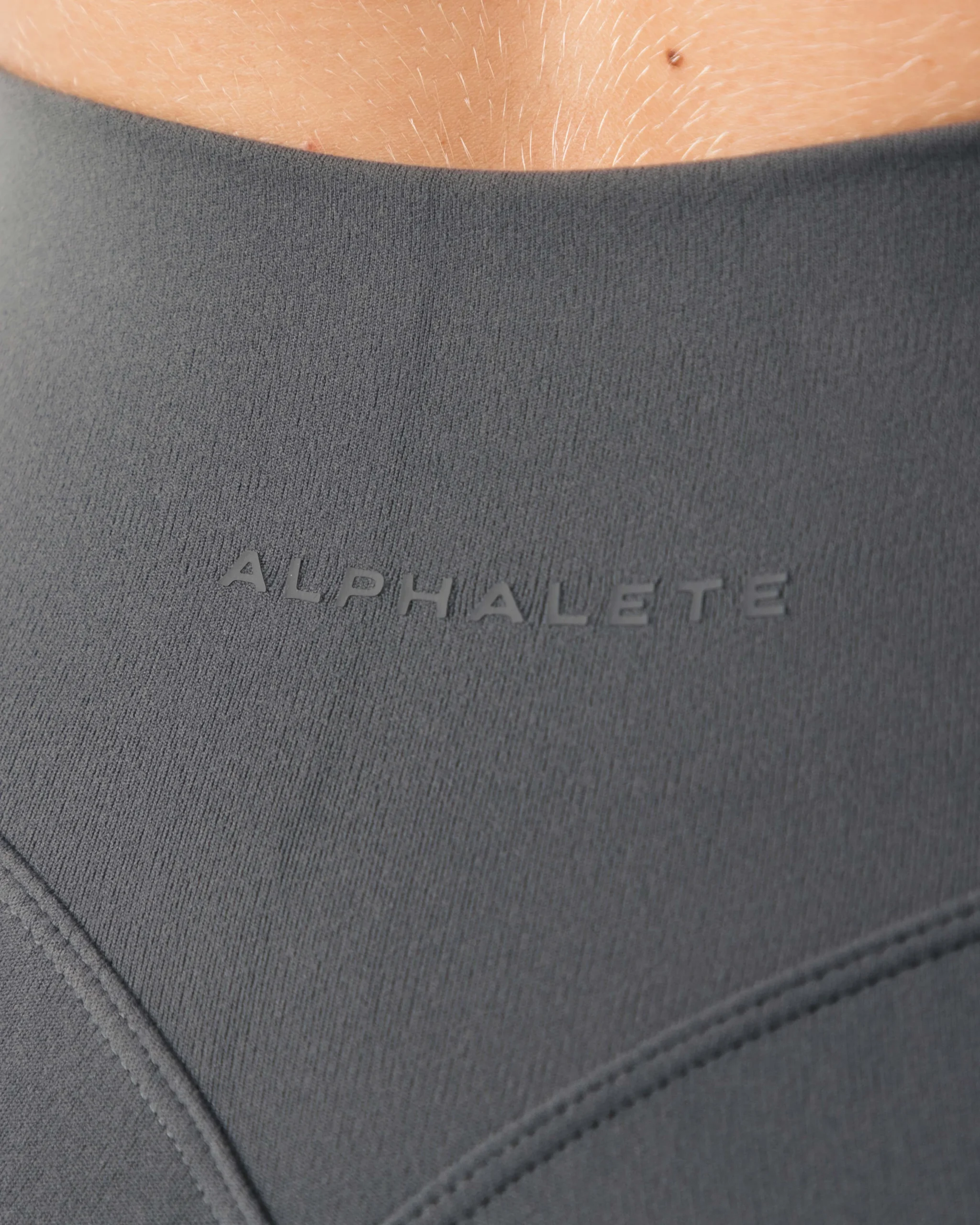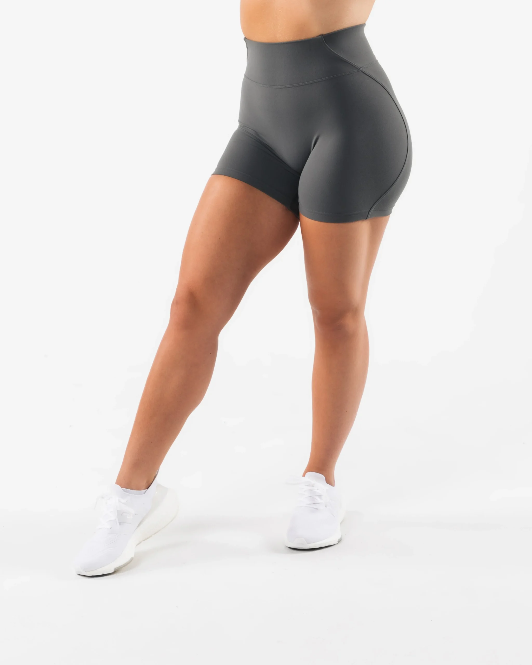 |HIGHLIGHTS|Sculpting seamlines|Buttery soft hand feel|High Stretch|5″ inseam|FIT SUGGESTION|This itemruns true to Alphalete’s standard sizing.|We recommend sizing up for a more relaxed fit or down for a more compressive fit.|Model is 5’2”/157.5cm, wearing a size S with 39″/99cm hips and 28”/71.1cm waist.|MATERIALS AND WASHING DIRECTIONS|75% Nylon, 25% Spandex|We recommend washing inside-out on a cold setting|Hang to dry|DESCRIPTION|Discover a fusion of supreme comfort and high-stretch compression with our new Aura fabric. Made with irresistibly soft, brushed fabric, our shorts offer you unrestricted movement whether you’re headed to the gym, a yoga class, or simply lounging at home. We’ve strategically placed sculpting seamlines to not only draw in the waist but also enhance the natural shape of the glutes.