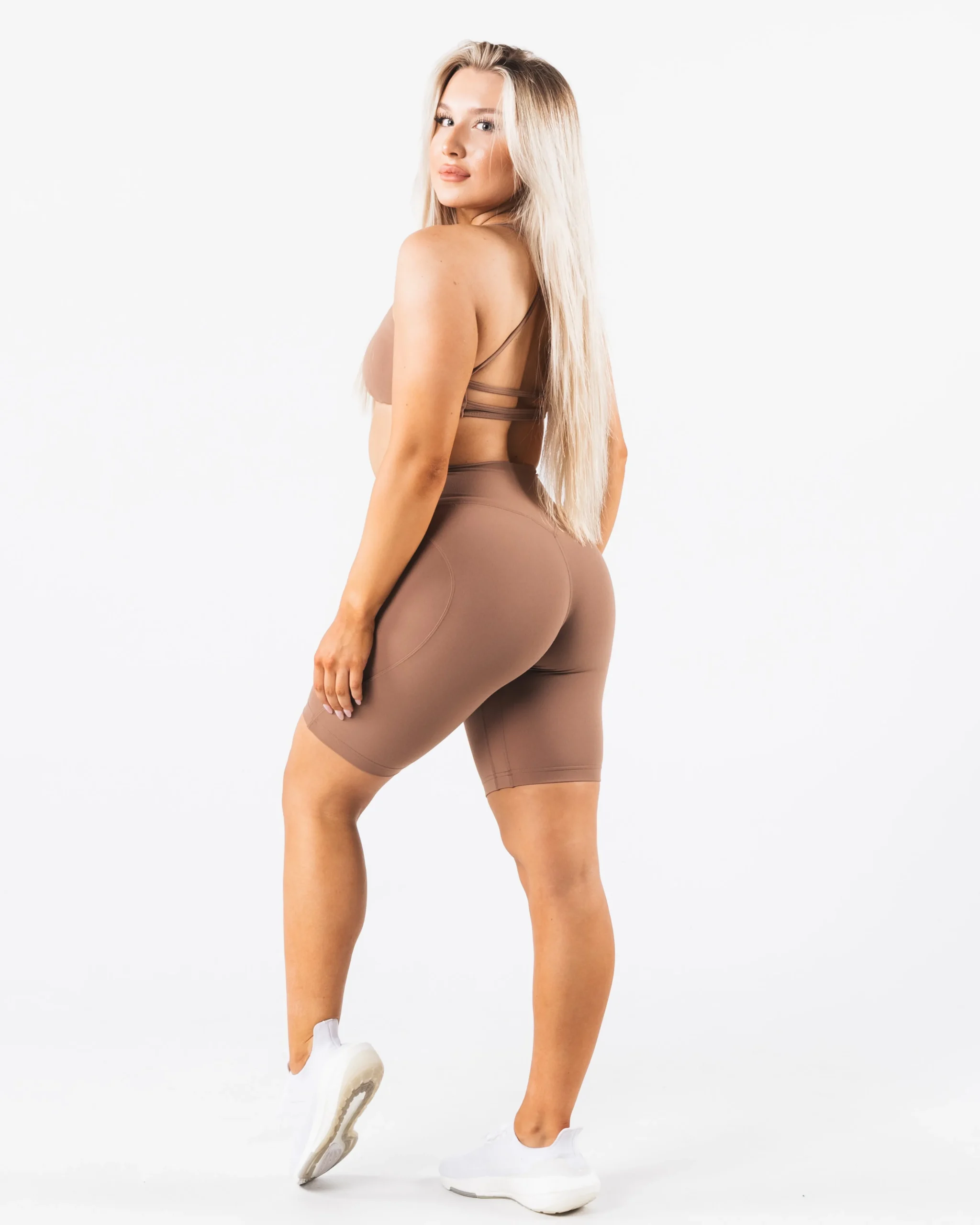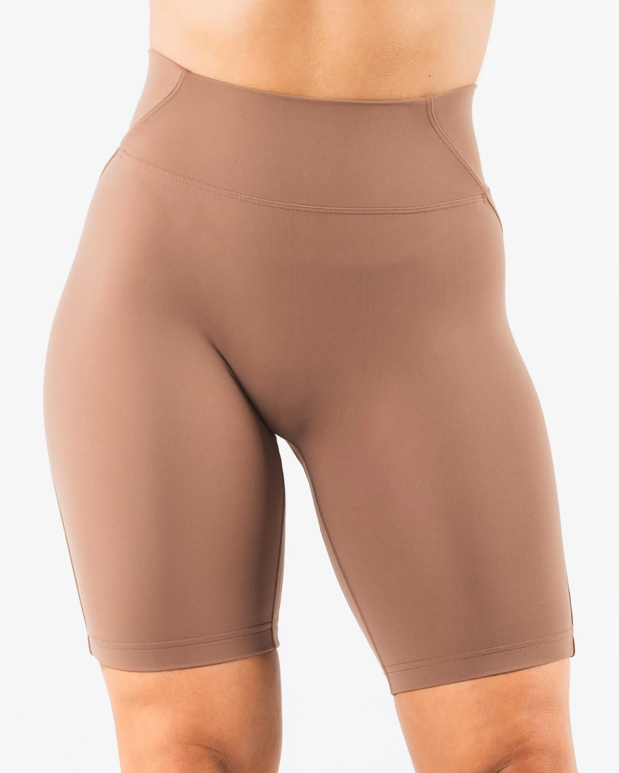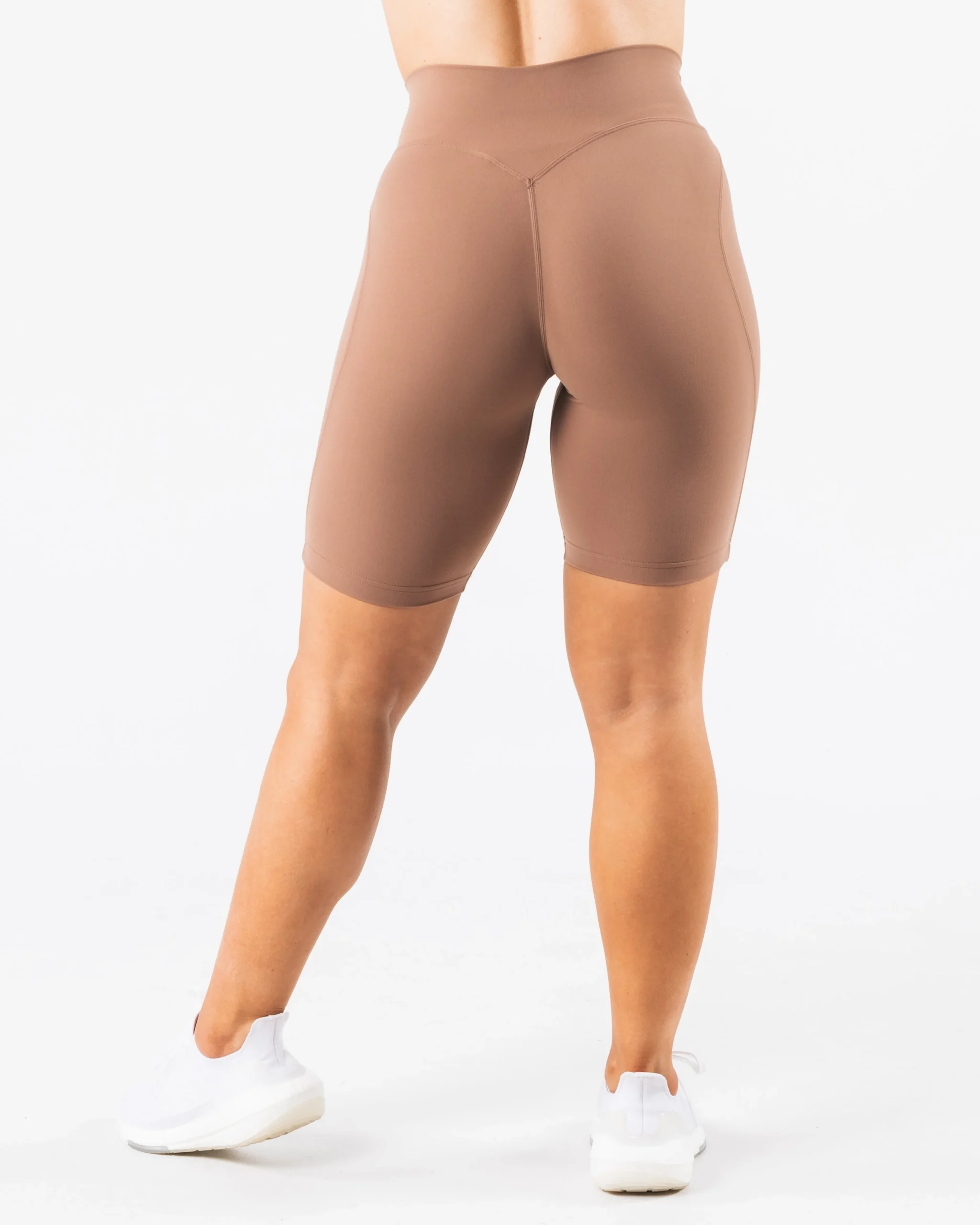 |HIGHLIGHTS|Sculpting seamlines|Buttery soft hand feel|High Stretch|9″ inseam|FIT SUGGESTION|This itemruns true to Alphalete’s standard sizing.|We recommend sizing up for a more relaxed fit or down for a more compressive fit.|Model is|5’2”/157.5cm, wearing a sizeSwith 39″/99cm hips and 28”/71.1cm waist.|MATERIALS AND WASHING DIRECTIONS|75% Nylon, 25% Spandex|We recommend washing inside-out on a cold setting|Hang to dry|DESCRIPTION|Discover a fusion of supreme comfort and high-stretch compression with our new Aura fabric. Made with irresistibly soft, brushed fabric, our shorts offer you unrestricted movement whether you’re headed to the gym, a yoga class, or simply lounging at home. We’ve strategically placed sculpting seamlines to not only draw in the waist but also enhance the natural shape of the glutes.