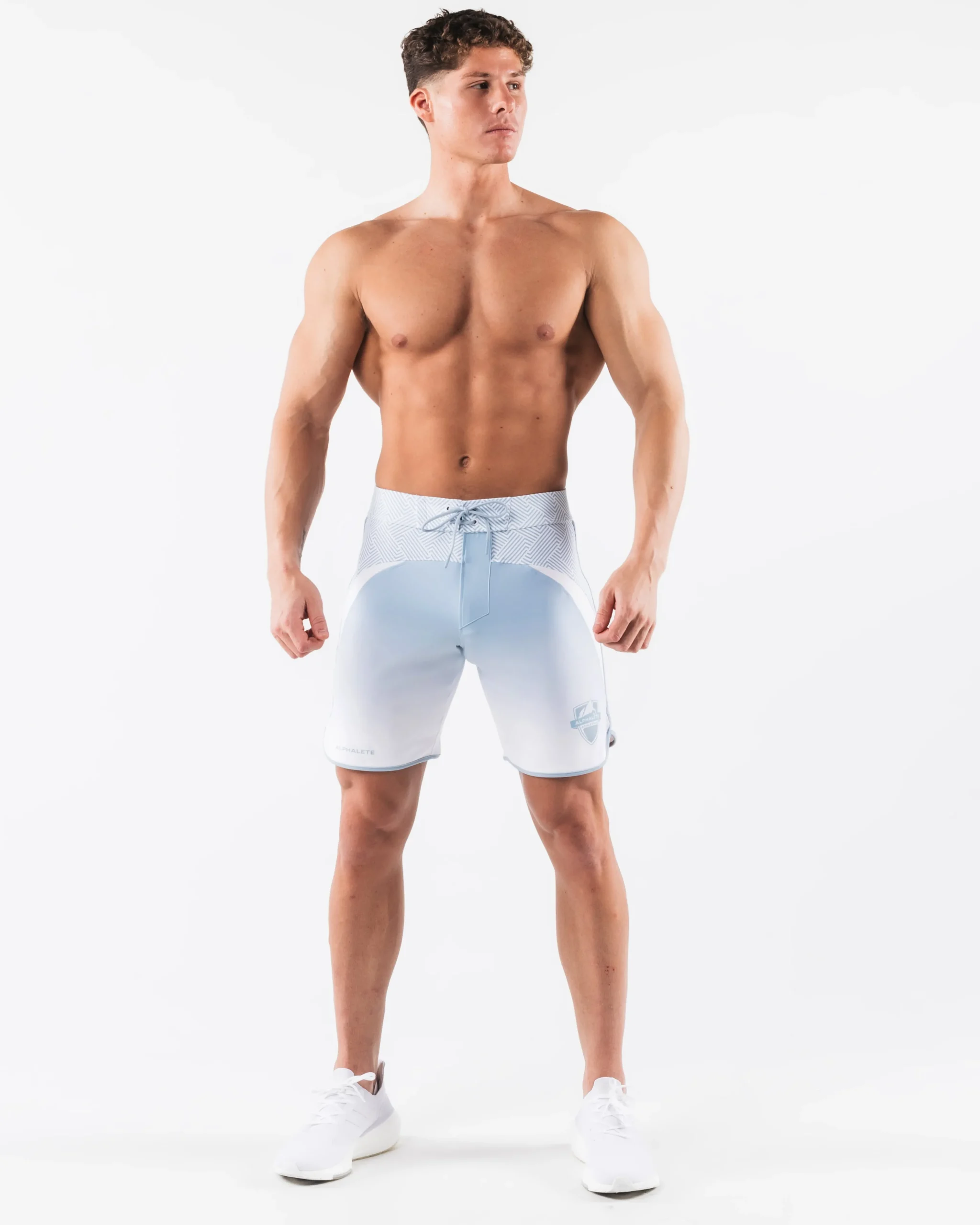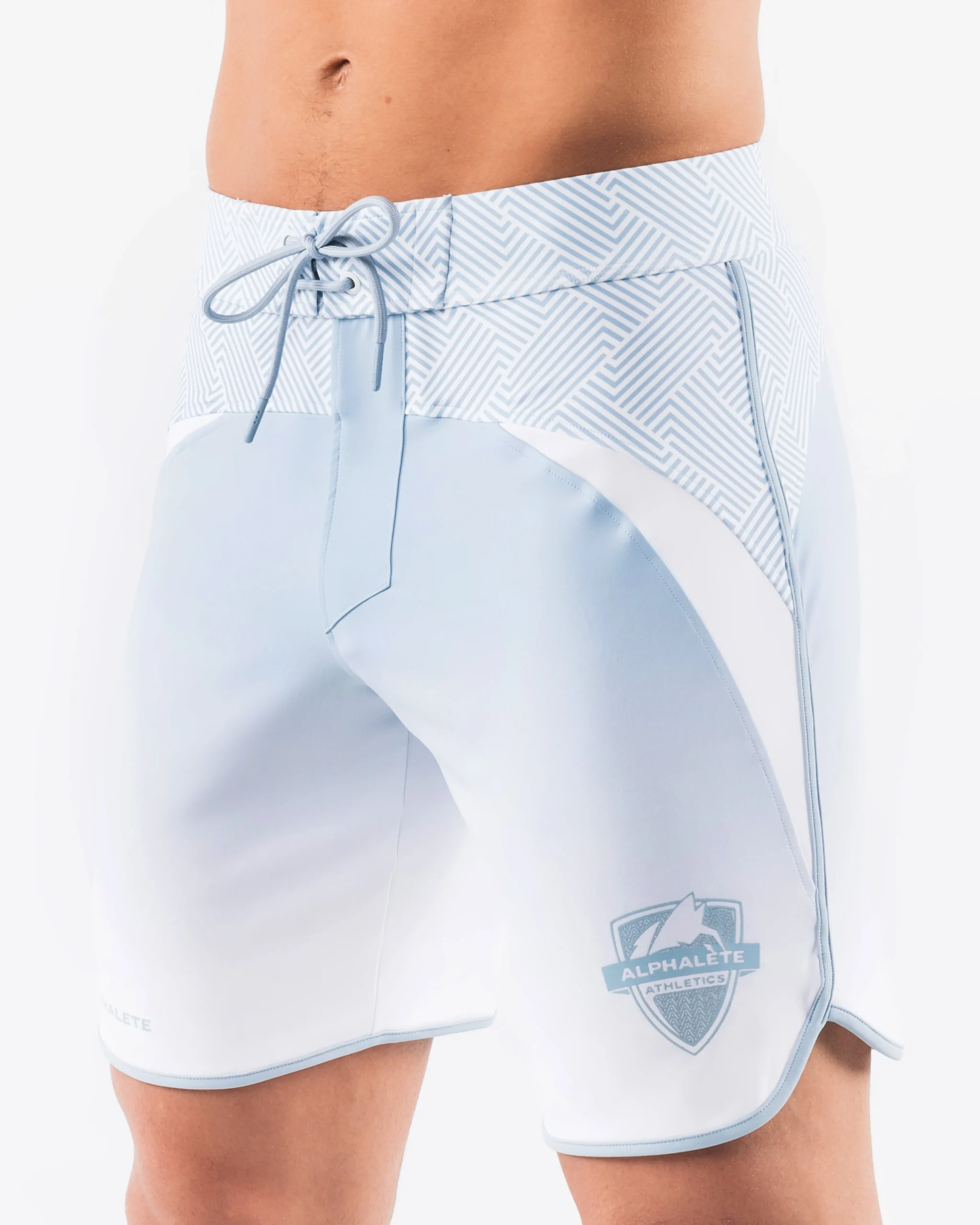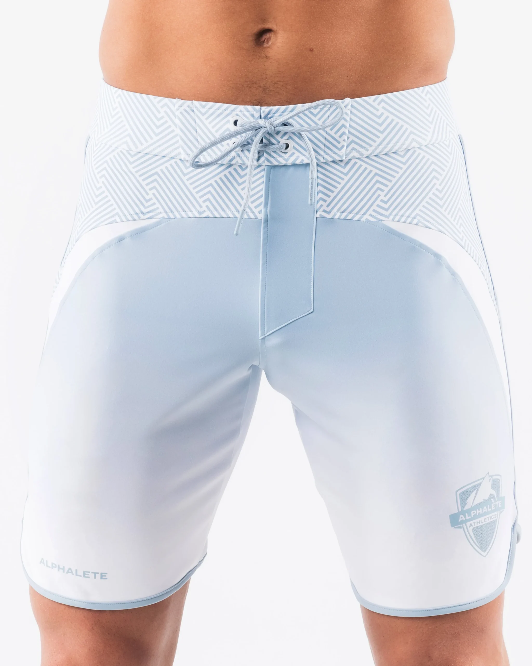 HIGHLIGHTS|Unlined boardshort|9” inseam|Reflective branding at leg opening and back waistband|Elastic waistband with adjustable self-tie drawcords|Color-blocking panelling|Water resistant fabric|FIT SUGGESTION|This item runs true to Alphalete’s standard sizing.|Fit is based off of waist size in inches.|If you are between sizes, we recommend sizing up for a relaxed fit.|Eric is 6’2”/188cm, wearing a size 32.|MATERIALS AND WASHING DIRECTIONS|67% Nylon, 23% spandex|Due to the high saturation of colors, initial fabric bleed may occur|We recommend washing inside-out on a cold setting|Hang to dry|DESCRIPTION|Our Crescent Short emerges as asymbol of elegance and grace. Like the crescent moon itself, this shortembodies the aesthetic of a subtlecurve, capturing the essence of celestial wonder.|