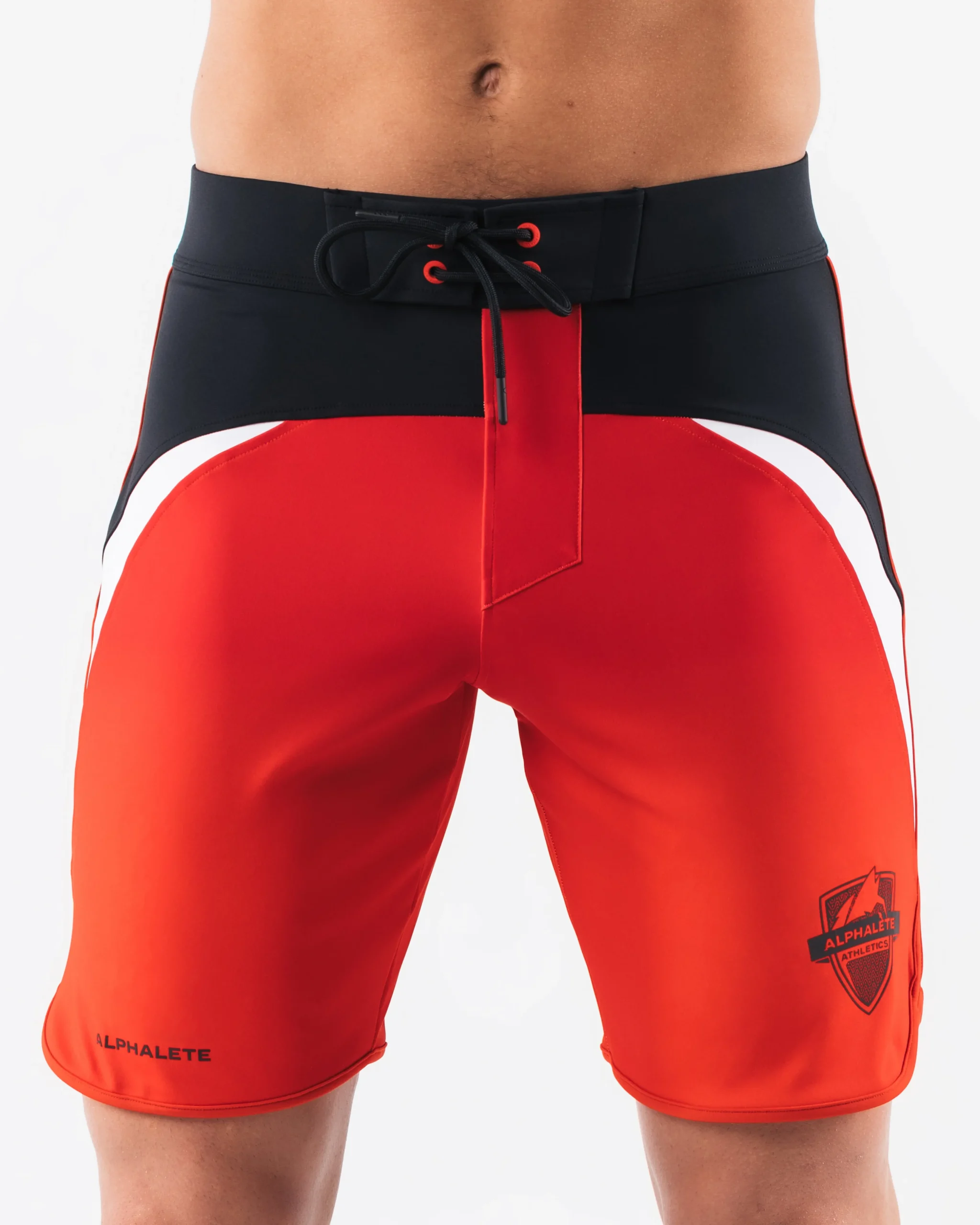 HIGHLIGHTS|Unlined boardshort|9” inseam|Reflective branding at leg opening and back waistband|Elastic waistband with adjustable self-tie drawcords|Color-blocking panelling|Water resistant fabric|FIT SUGGESTION|This item runs true to Alphalete’s standard sizing.|Fit is based off of waist size in inches.|If you are between sizes, we recommend sizing up for a relaxed fit.|Eric is 6’2”/188cm, wearing a size 32.|MATERIALS AND WASHING DIRECTIONS|67% Nylon, 23% spandex|Due to the high saturation of colors, initial fabric bleed may occur|We recommend washing inside-out on a cold setting|Hang to dry|DESCRIPTION|Our Crescent Short emerges as asymbol of elegance and grace. Like the crescent moon itself, this shortembodies the aesthetic of a subtlecurve, capturing the essence of celestial wonder.|