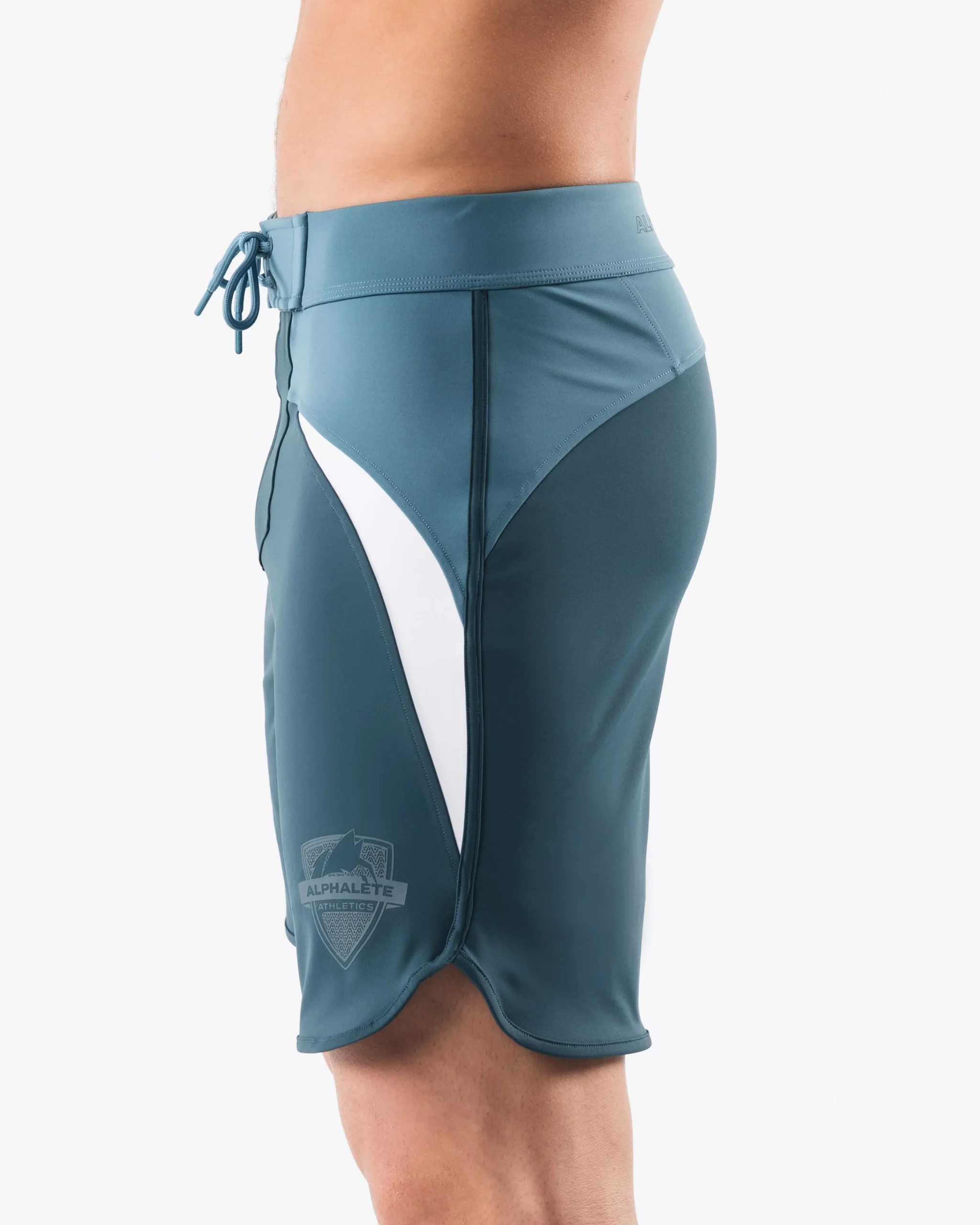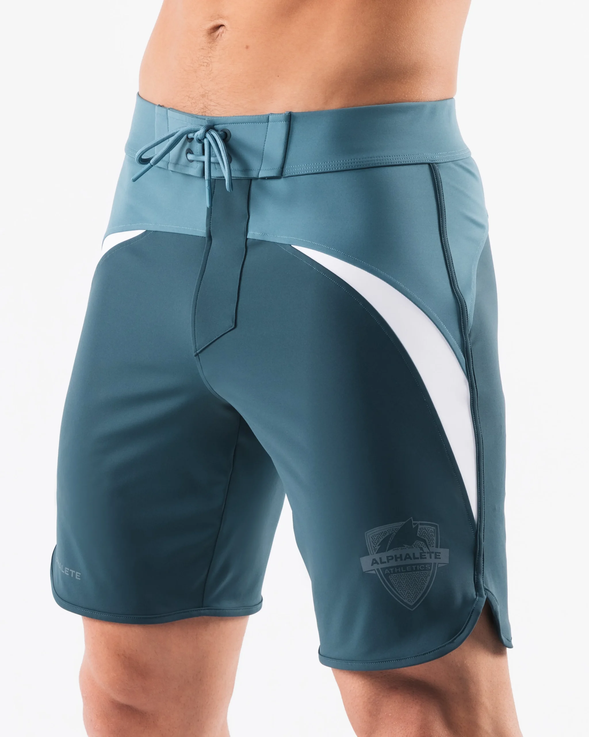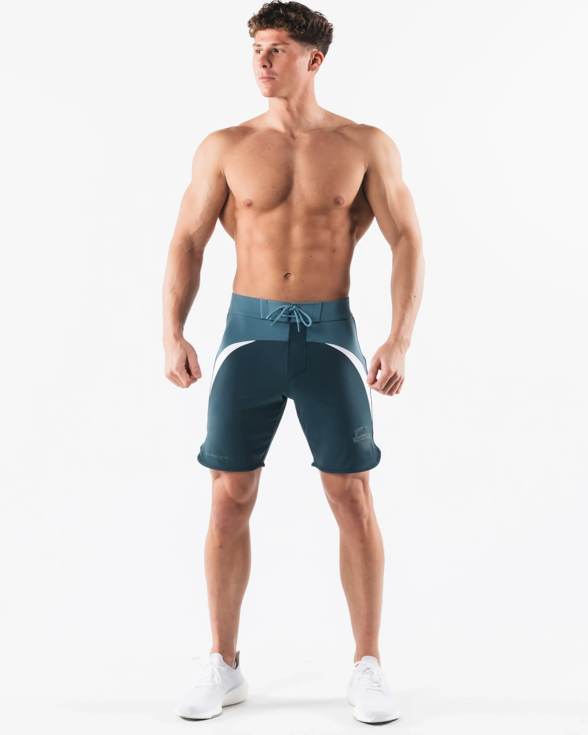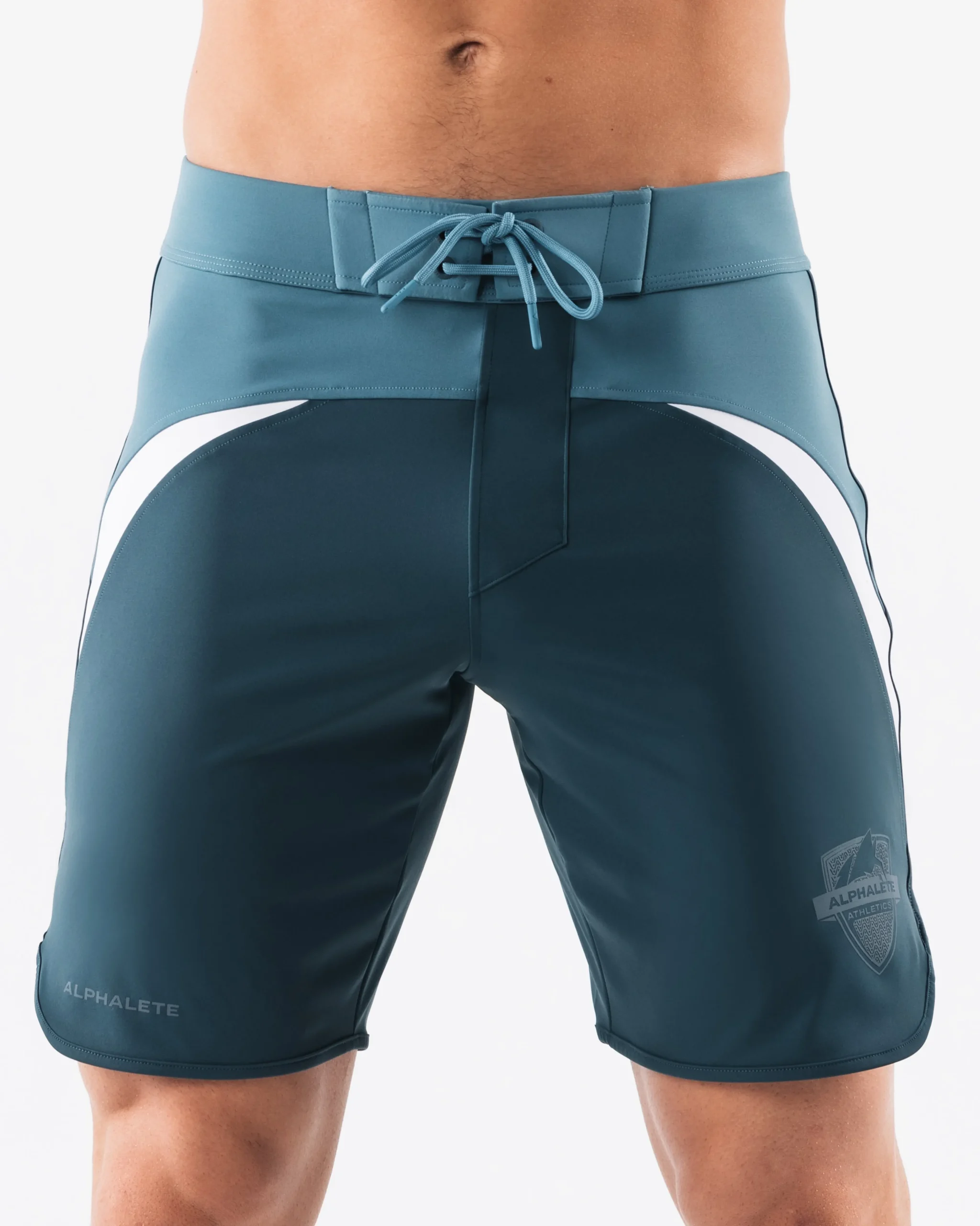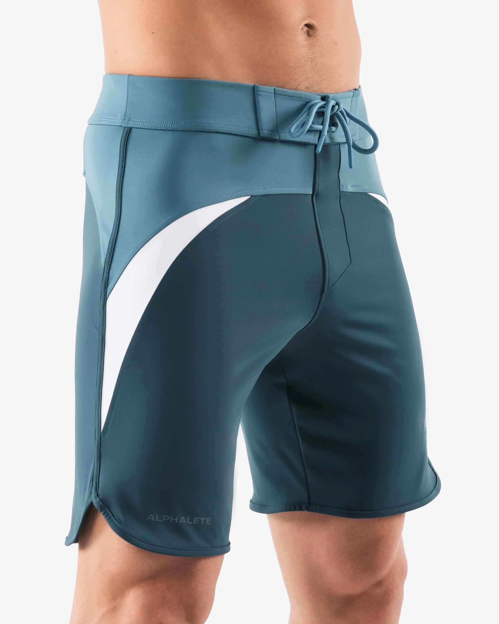 HIGHLIGHTS|Unlined boardshort|9” inseam|Reflective branding at leg opening and back waistband|Elastic waistband with adjustable self-tie drawcords|Color-blocking panelling|Water resistant fabric|FIT SUGGESTION|This item runs true to Alphalete’s standard sizing.|Fit is based off of waist size in inches.|If you are between sizes, we recommend sizing up for a relaxed fit.|Eric is 6’2”/188cm, wearing a size 32.|MATERIALS AND WASHING DIRECTIONS|67% Nylon, 23% spandex|Due to the high saturation of colors, initial fabric bleed may occur|We recommend washing inside-out on a cold setting|Hang to dry|DESCRIPTION|Our Crescent Short emerges as asymbol of elegance and grace. Like the crescent moon itself, this shortembodies the aesthetic of a subtlecurve, capturing the essence of celestial wonder.|