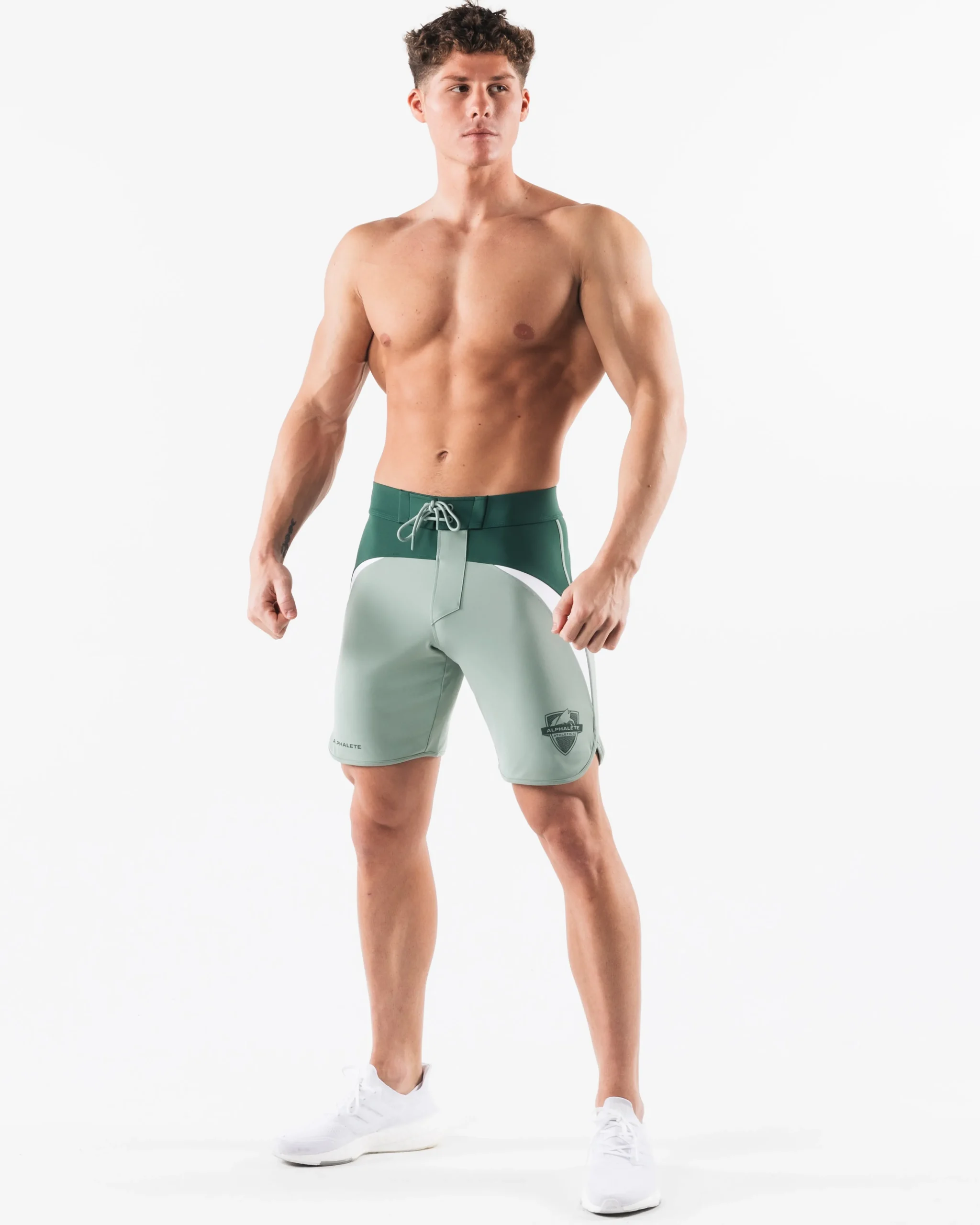 HIGHLIGHTS|Unlined boardshort|9” inseam|Reflective branding at leg opening and back waistband|Elastic waistband with adjustable self-tie drawcords|Color-blocking panelling|Water resistant fabric|FIT SUGGESTION|This item runs true to Alphalete’s standard sizing.|Fit is based off of waist size in inches.|If you are between sizes, we recommend sizing up for a relaxed fit.|Eric is 6’2”/188cm, wearing a size 32.|MATERIALS AND WASHING DIRECTIONS|67% Nylon, 23% spandex|Due to the high saturation of colors, initial fabric bleed may occur|We recommend washing inside-out on a cold setting|Hang to dry|DESCRIPTION|Our Crescent Short emerges as asymbol of elegance and grace. Like the crescent moon itself, this shortembodies the aesthetic of a subtlecurve, capturing the essence of celestial wonder.|