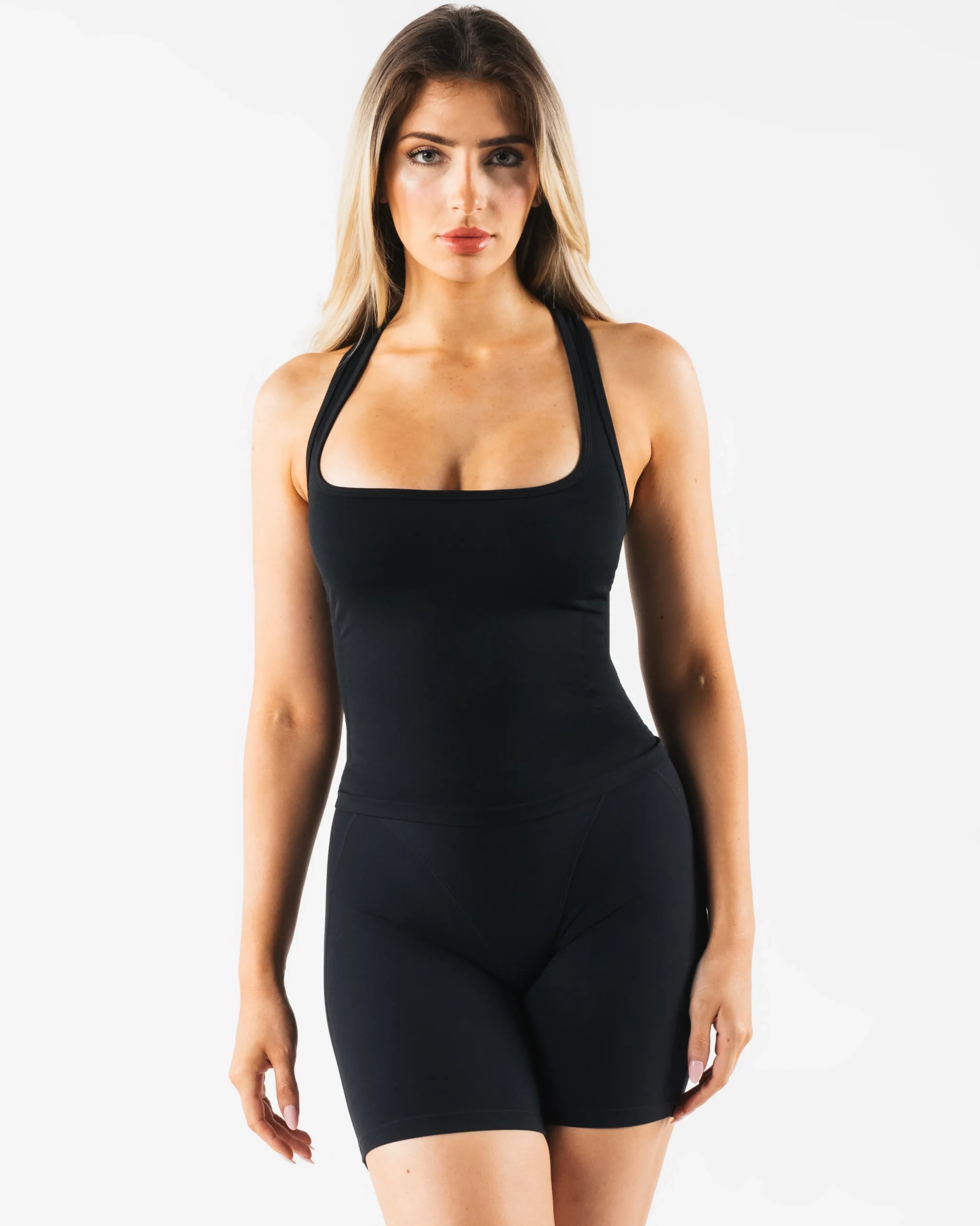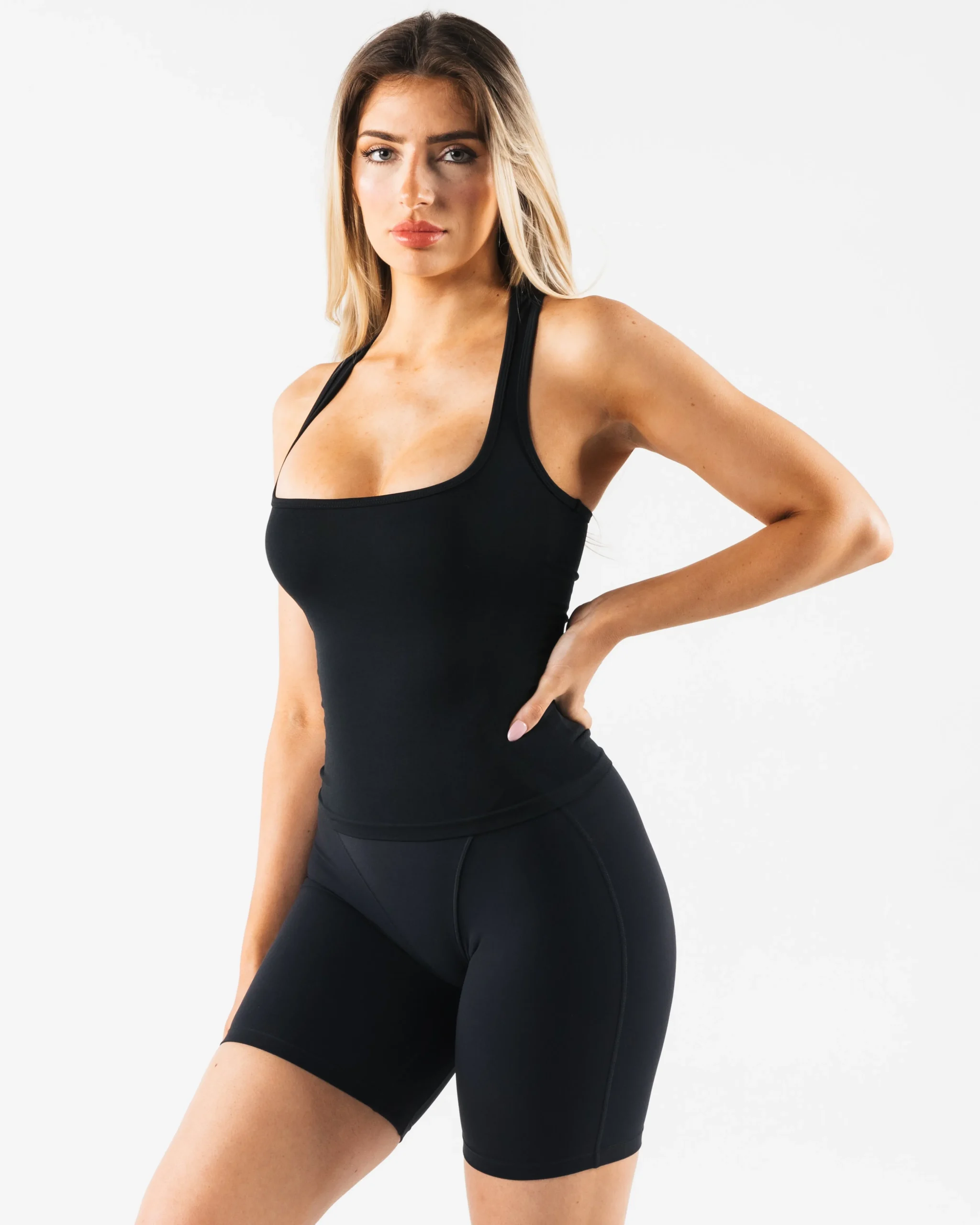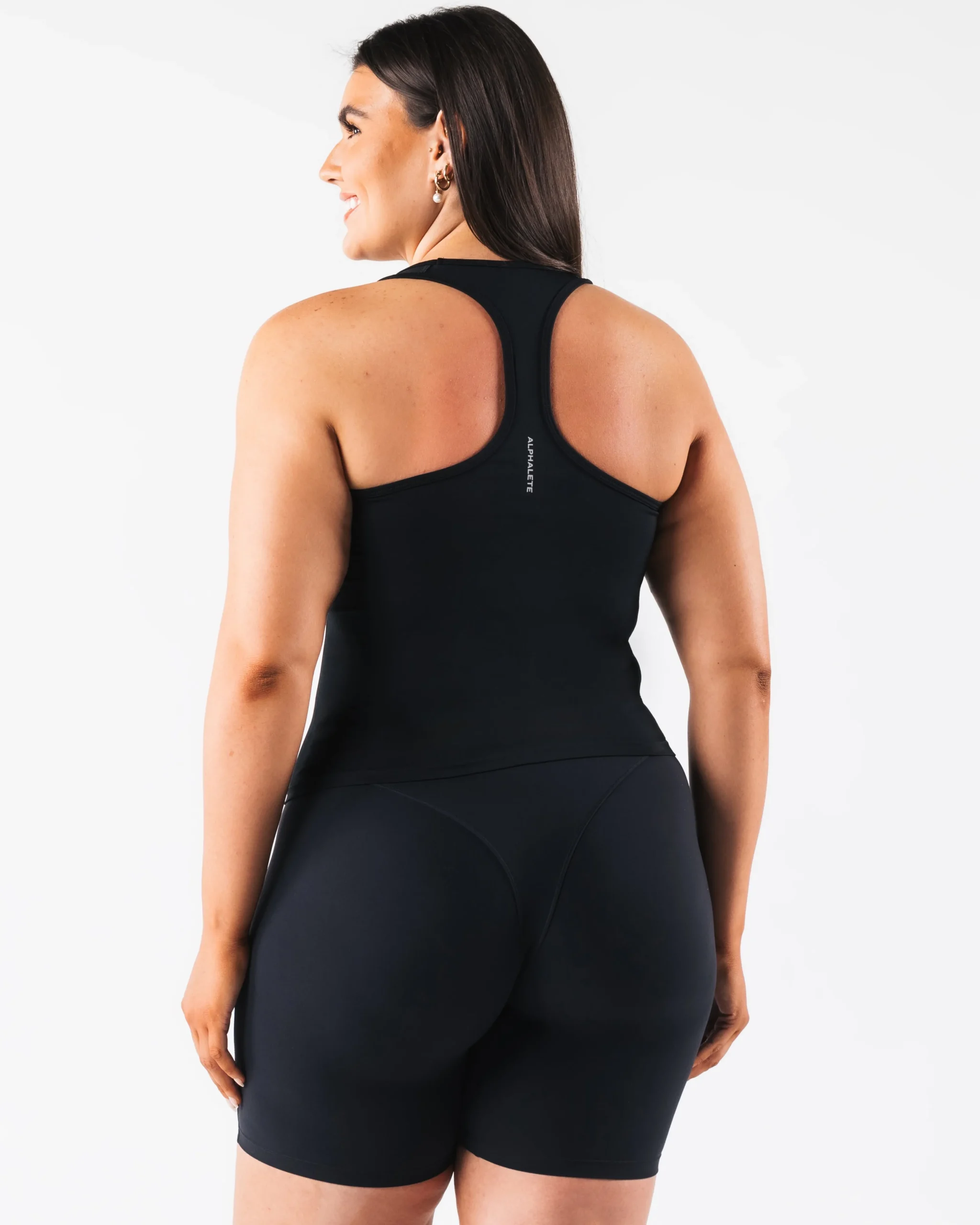 HIGHLIGHTS|Racerback|Square neck|Smooth|High sweat|FIT SUGGESTION|This itemruns true to Alphalete’s standard fit.|Skylar is 5’7”/170.2cm, wearing a size XS with 34.5″/87.6cm bust.|MATERIALS AND WASHING DIRECTIONS|51% Polyamide, 38% Polyester, 11% Elastane|We recommend washing inside-out on a cold setting|Hang to dry|DESCRIPTION|With the same tried and true amplify fabric, the new Ice tank makes for the perfect, versatile layering piece. Compression and breathability allows you to look and feel your best. Our original amplify fabric creates an irresistibly silky, smooth hand-feel while the full-interlocking knit offers the flexibility to move freely.|
