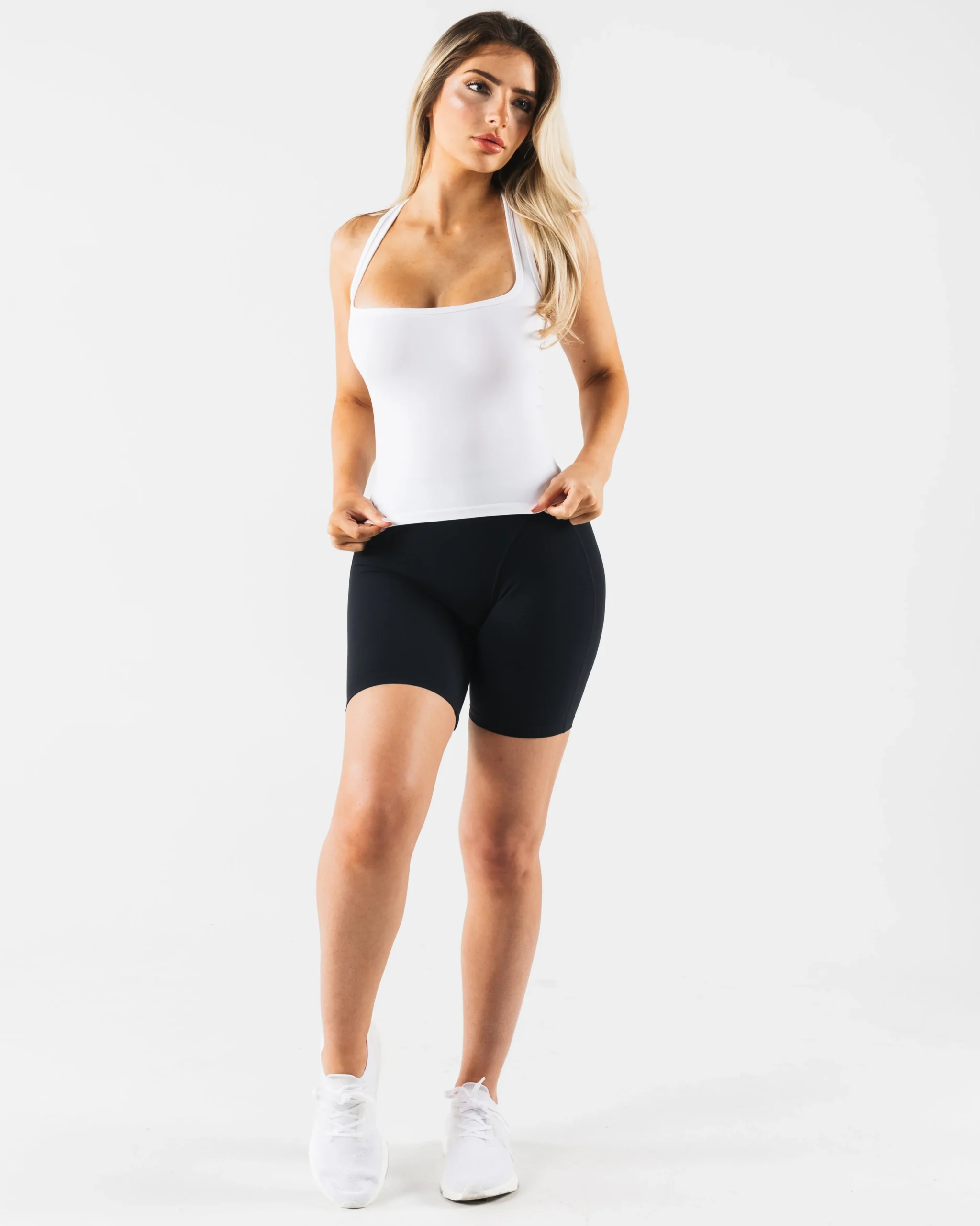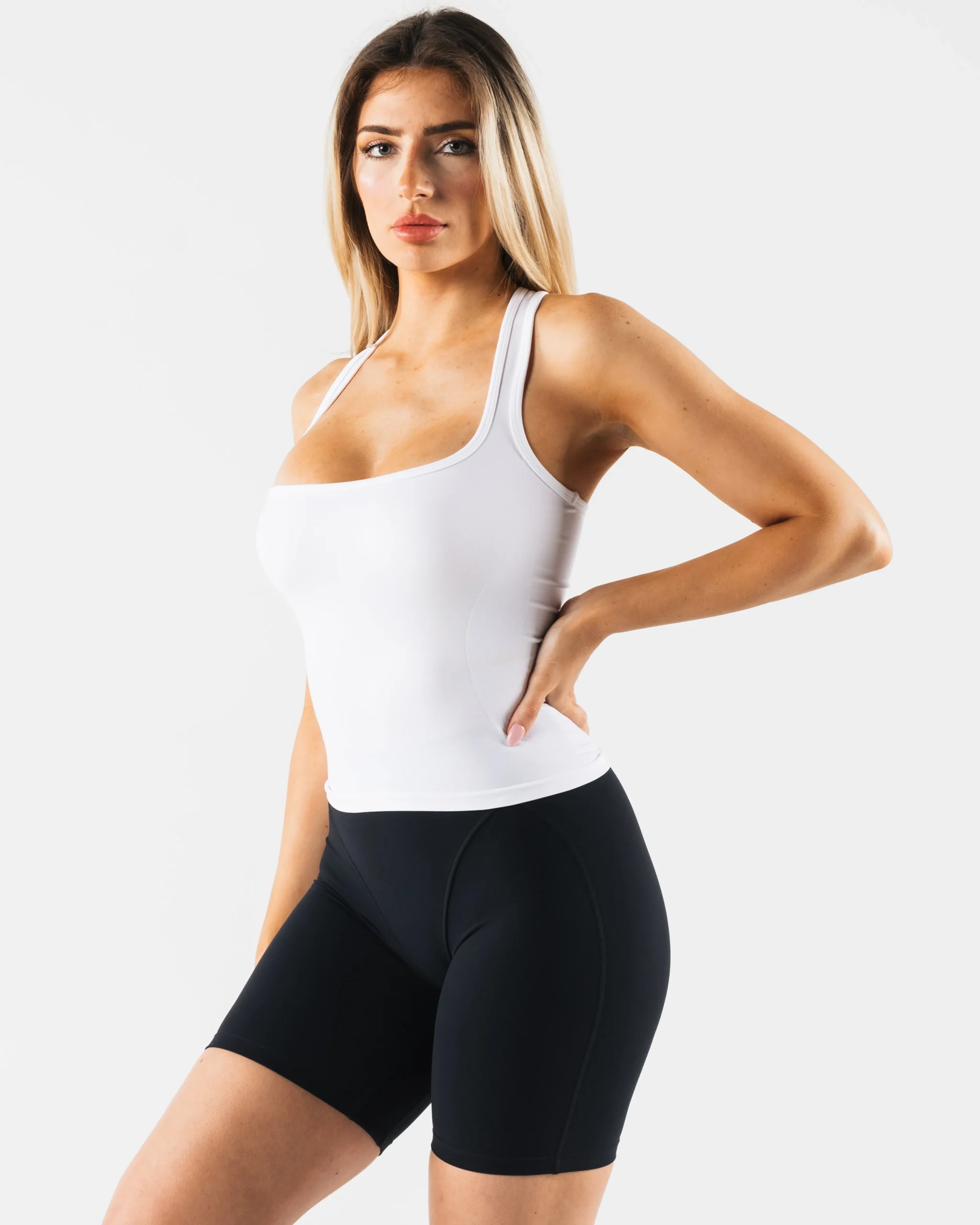 HIGHLIGHTS|Racerback|Square neck|Smooth|High sweat|FIT SUGGESTION|This itemruns true to Alphalete’s standard fit.|Skylar is 5’7”/170.2cm, wearing a size XS with 34.5″/87.6cm bust.|MATERIALS AND WASHING DIRECTIONS|51% Polyamide, 38% Polyester, 11% Elastane|We recommend washing inside-out on a cold setting|Hang to dry|DESCRIPTION|With the same tried and true amplify fabric, the new Ice tank makes for the perfect, versatile layering piece. Compression and breathability allows you to look and feel your best. Our original amplify fabric creates an irresistibly silky, smooth hand-feel while the full-interlocking knit offers the flexibility to move freely.|