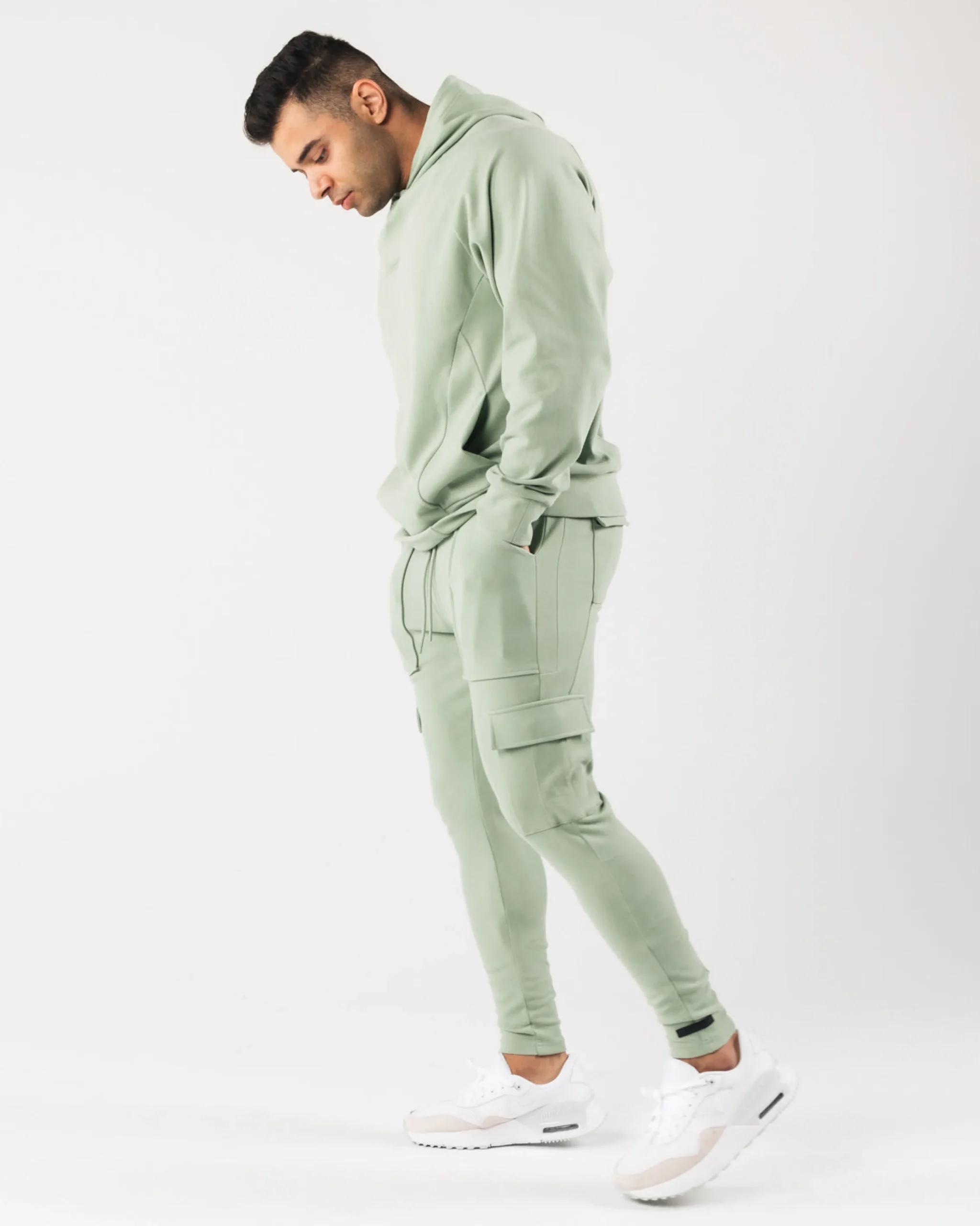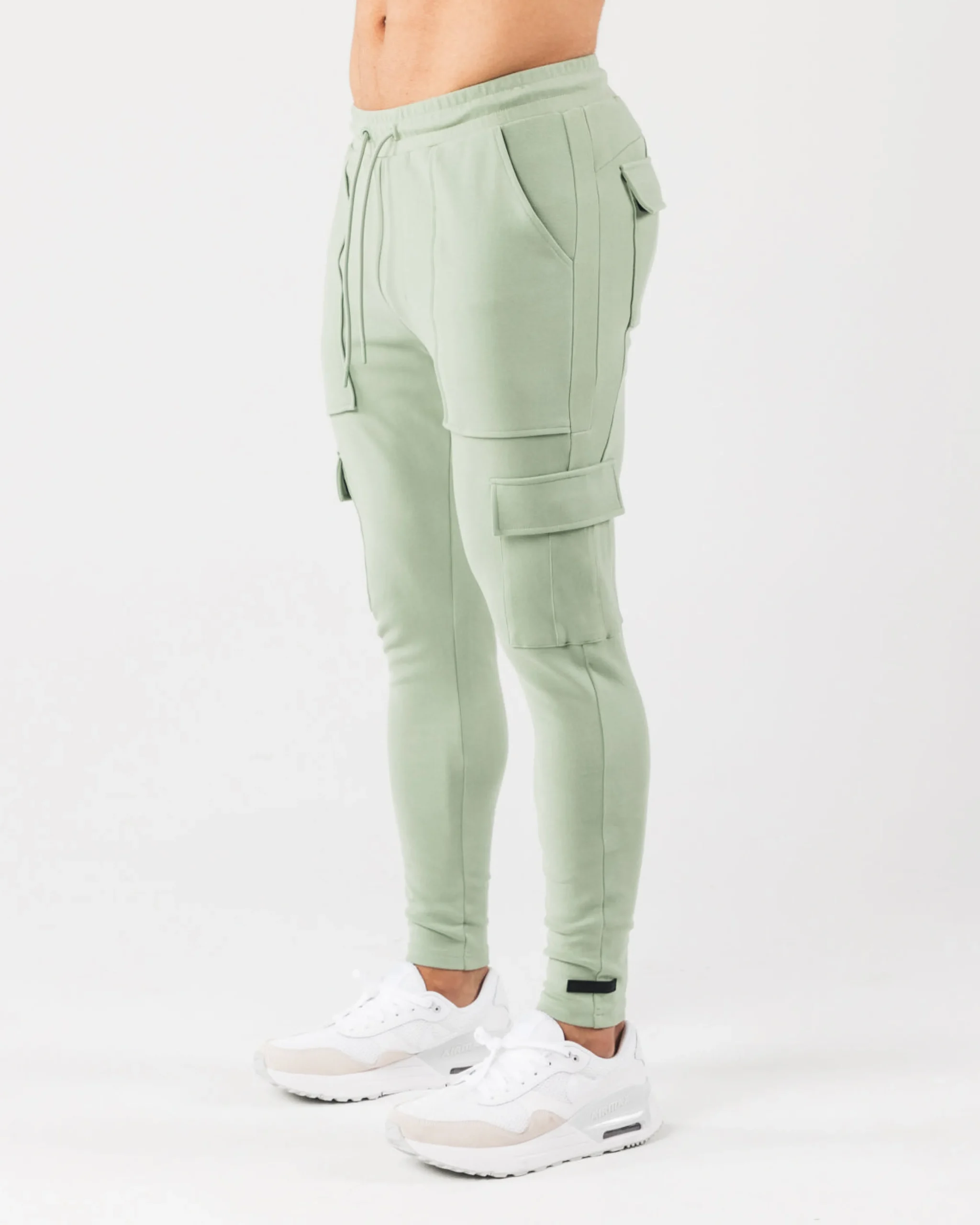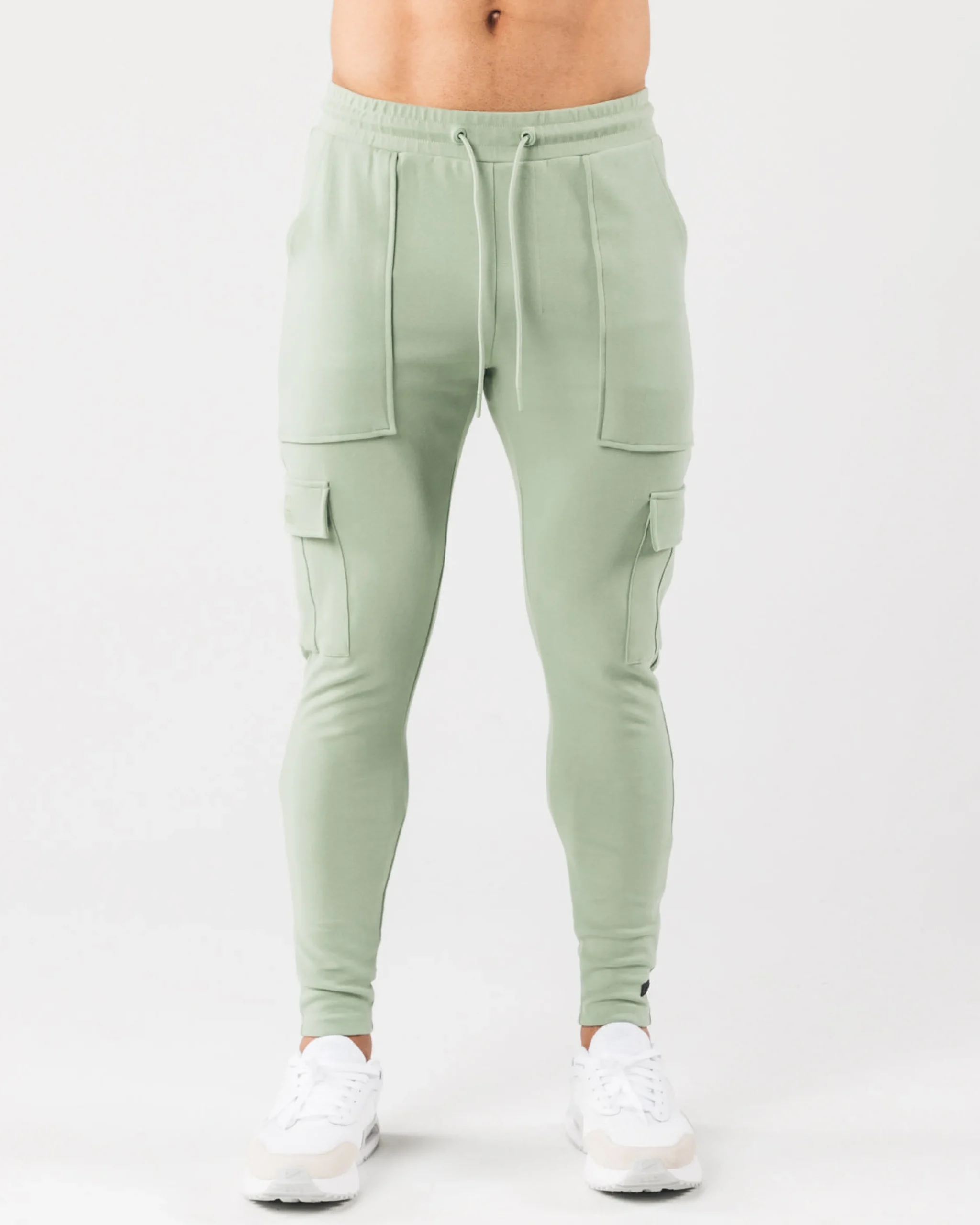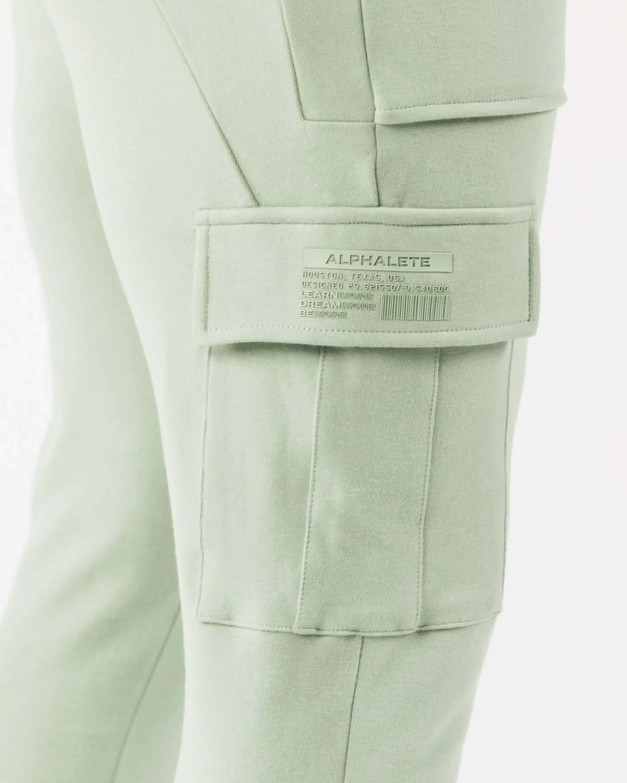 |HIGHLIGHTS|Low-rise jogger with tapered leg fit|Stretchy fabric with a soft brushed surface|Open front pockets|Identity silicone print on right cargo pocket|Dual back and leg pockets with silent velcro closure|Folded seams with faux pleats|Knee dart for structural support|Color-matching drawstrings and trims|Alphalete identity silicone label stitched on left leg|28.5” Inseam|FIT SUGGESTION|This item runs true to Alphalete’s standard fit.|If you are between sizes, we recommend sizing up for a relaxed fit.|Model is 5’10”/177.8cm, wearing a size M with a 34.5”/87.6cm waist.|MATERIALS AND WASHING DIRECTIONS|95% Cotton, 5% Elastane|We recommend washing inside-out on a cold setting|Hang to dry|Our Identity Collection offers Luxurious, brushed surface with an added silicone wash gives a plush and velvety hand-feel. All Identity piece are made with 4-way stretch fabric, offering both superior shape retention and warmth. This range was designed to increase internal comfort, without sacrificing aesthetics. This collection packs physique enhancing, confidence inducing seam work that is able to withstand intense activity through structurally supportive darts and panels. The Identity collection uses only the highest quality of infused, silicone branding that delivers state-of-art, water resistant technology and is incredibly durable. Identity outerwear offers a relaxed fit for the ideal lounge look, while identity bottoms feature expert teeing for a fitted, sporty look.