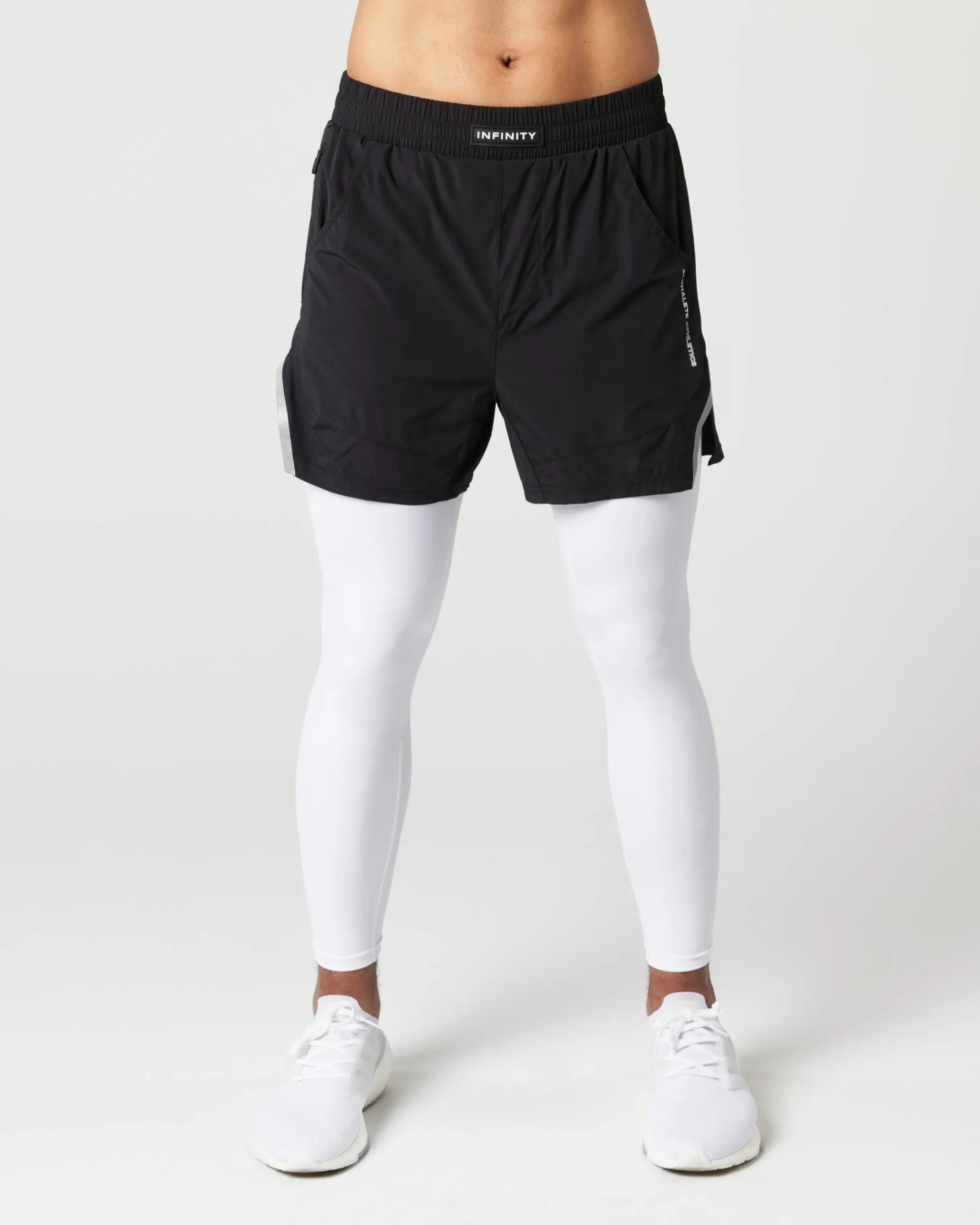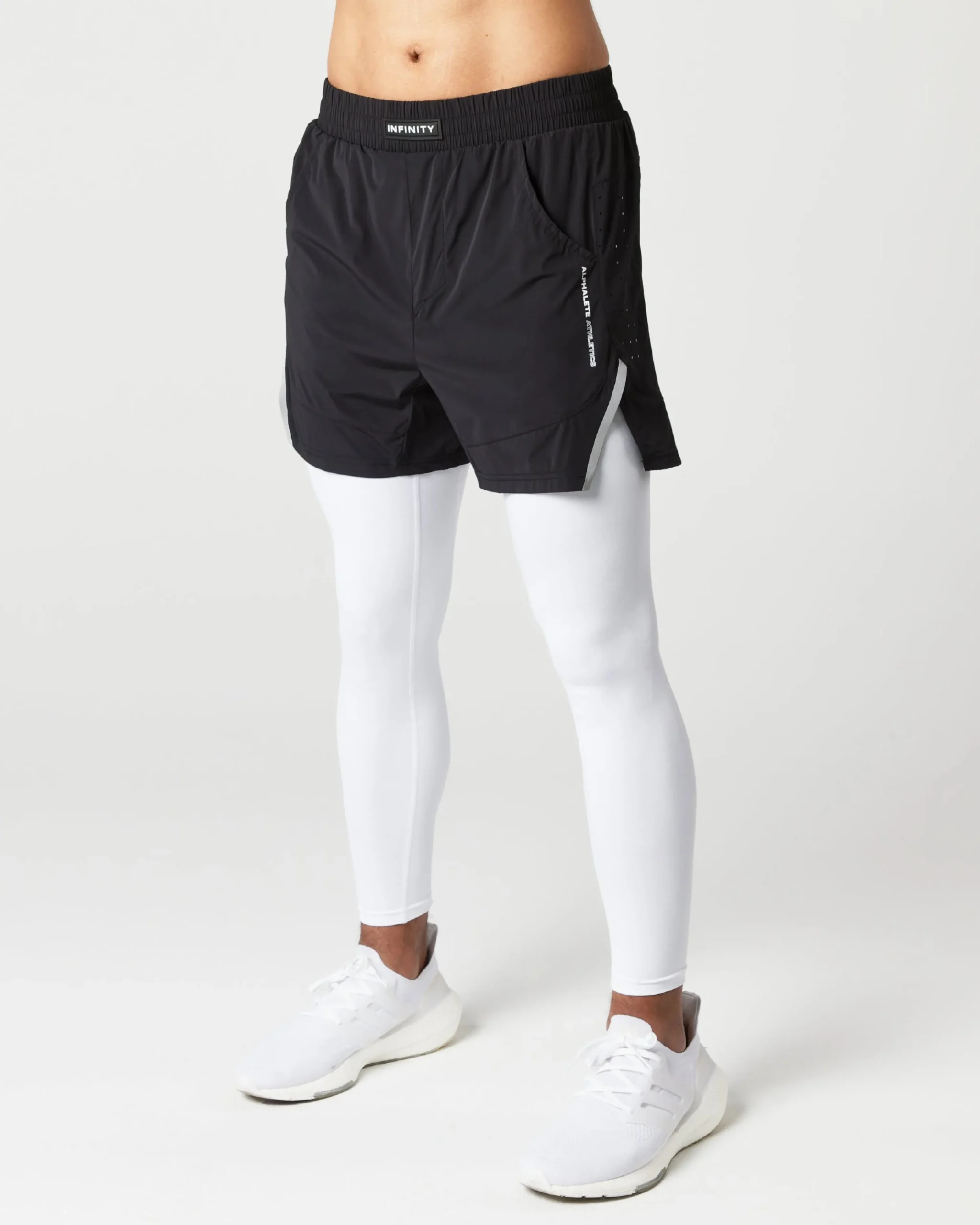 |HIGHLIGHTS|Woven, compression-lined legging|5.5” Inseam|Front slip pockets|Size Up, if you don’t like compressive fit|Waterproof zipper on the right side with YKK zippers|Laser cut perforations for breathability|Custom branded flat profile drawstrings|Alphalete Infinity logo in premium silicone|Alphalete Athletics logo printed on left thigh|FIT SUGGESTION|This item runs true to Alphalete’s standard sizing.|If you are between sizes, we recommend sizing up for a relaxed fit.|Model is 6’3”/191cm, wearing a size L with a 38.5”/92cm waist.|MATERIALS AND WASHING DIRECTIONS|80% Nylon, 20% Elastane|We recommend washing inside-out on a cold setting|Hang to dry|DESCRIPTION|Designed for technical performance and recreation, the Infinity Collection offers a range of products guaranteed to take you through your toughest workouts. Alphalete understands the close synergy between garment and textile, which is why all infinity fabrics are expertly selected to provide superior sports performance. Alphalete Infinity speaks to those who demand the most out of life and have similar demands of their apparel. The Infinity Collection offers everything you’ll need to build the ultimate sports performance wardrobe. The range offers a wide selection of woven bottoms, knitted tops and compact all-conditions outerwear. Since day one, Alphalete has been leading the race to create the best sports performance wear on the market, consider this our victory lap.