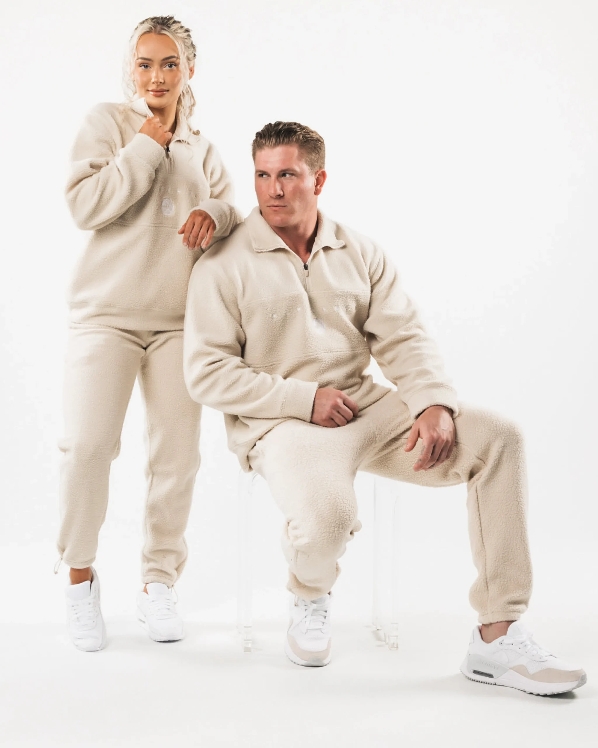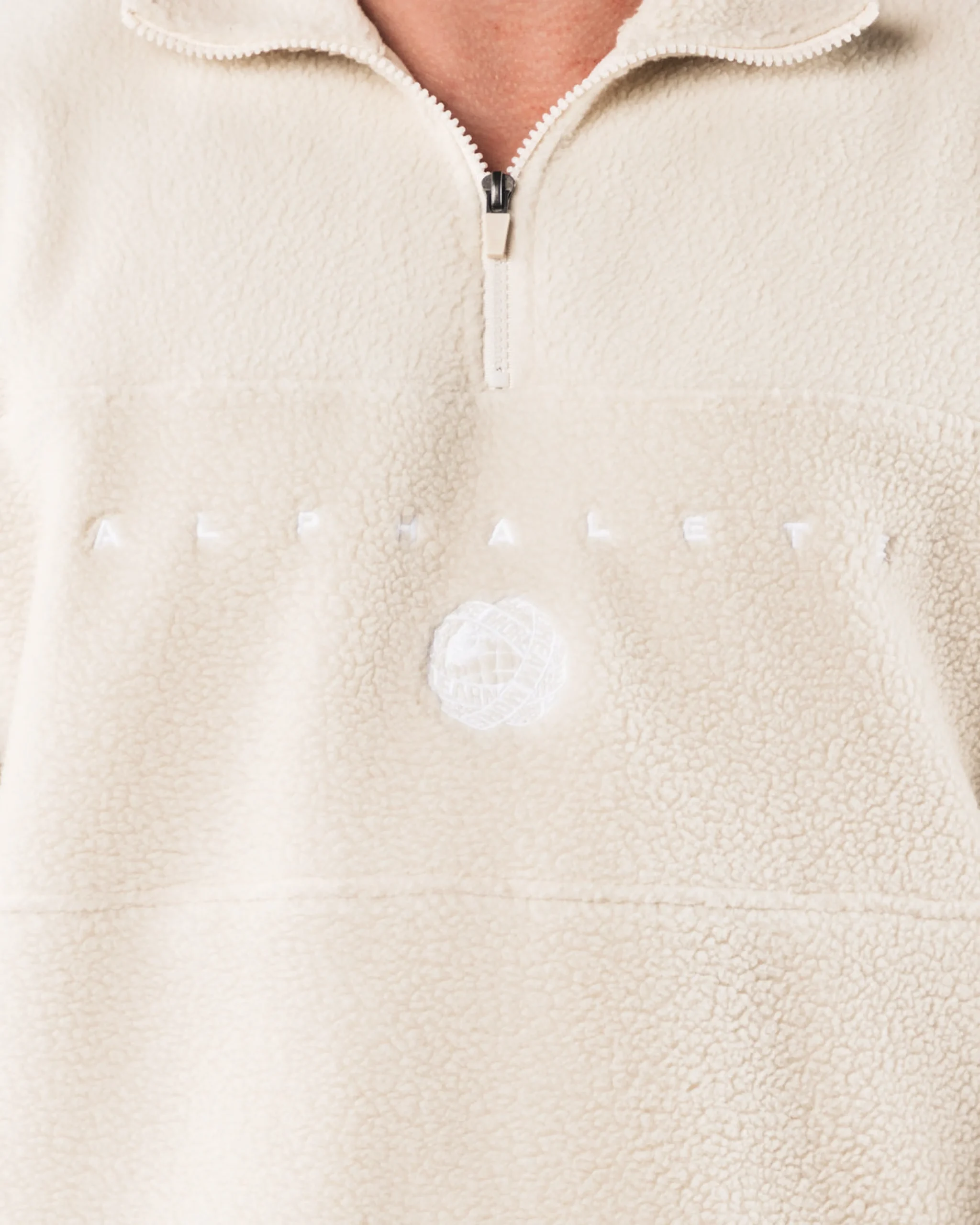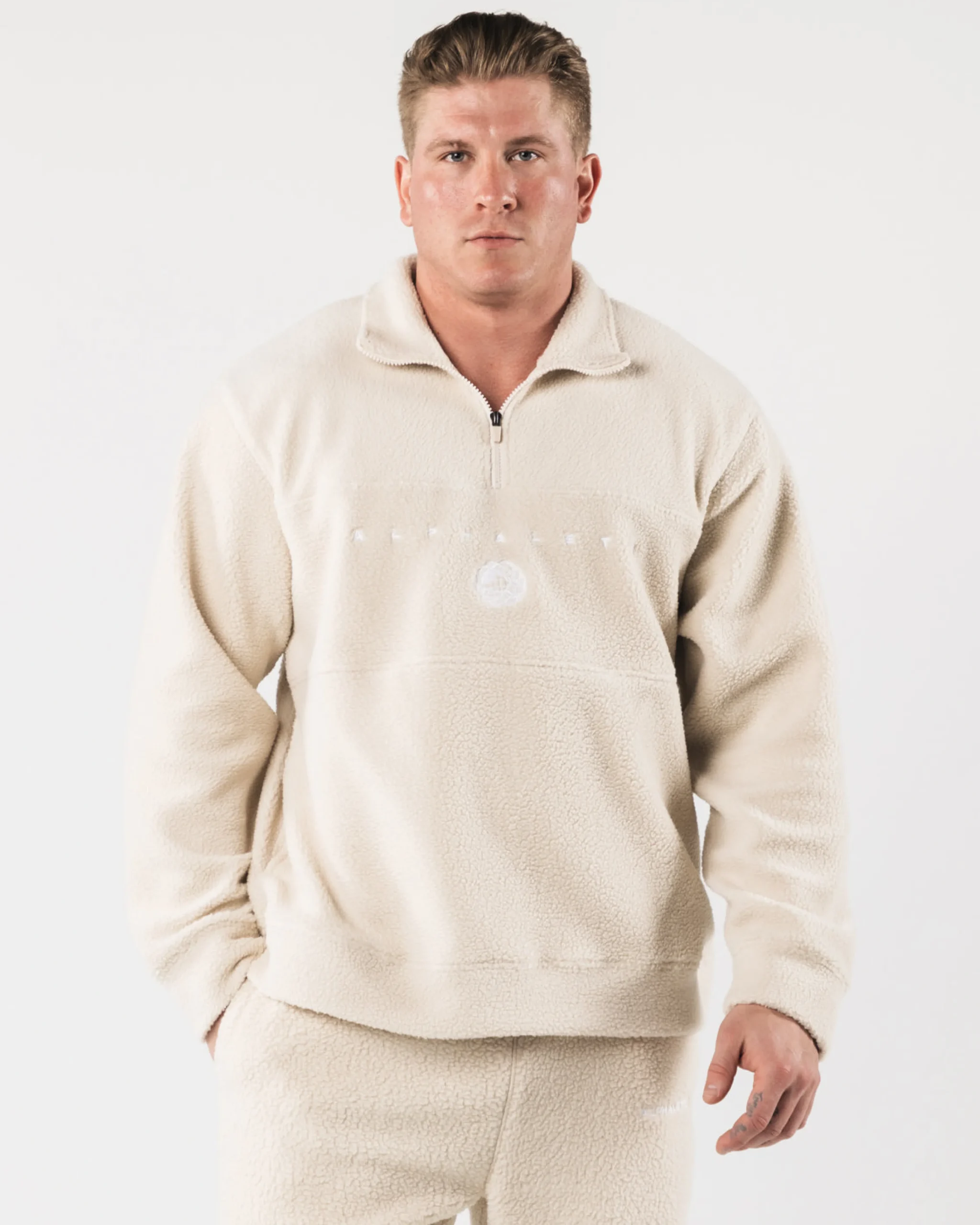 |HIGHLIGHTS|Mock neck collar|Quarter zip closure|Textured and plush fleece fabric|Embroidered Alphalete Classic + Globe logo on the center|FIT SUGGESTION|This item runs true to Alphalete’srelaxedfit.|If you are between sizes, we recommend sizing up.|Male model is 6’1”/185.4cm, wearing a size XL with a 44”/112cm chest.|Female model is 5’4″/162.5cm, wearing a size XS with a 33″/84cm bust.|MATERIALS AND WASHING DIRECTIONS|100%|Polyester|We recommend washing inside-out on a cold setting|Hang to dry|Introducing the King Collection: the epitome of coziness and versatility. Each piece is meticulouslycrafted to offer unrivaled comfort and functionality. Our signature textured fleece fabric envelops youin a soft, warm embrace, while the thoughtfully designed fit and neutral spring color palette cater toyour every need. The King Collection strikes the perfect balance between style and practicality,making these pieces indispensable in your wardrobe.