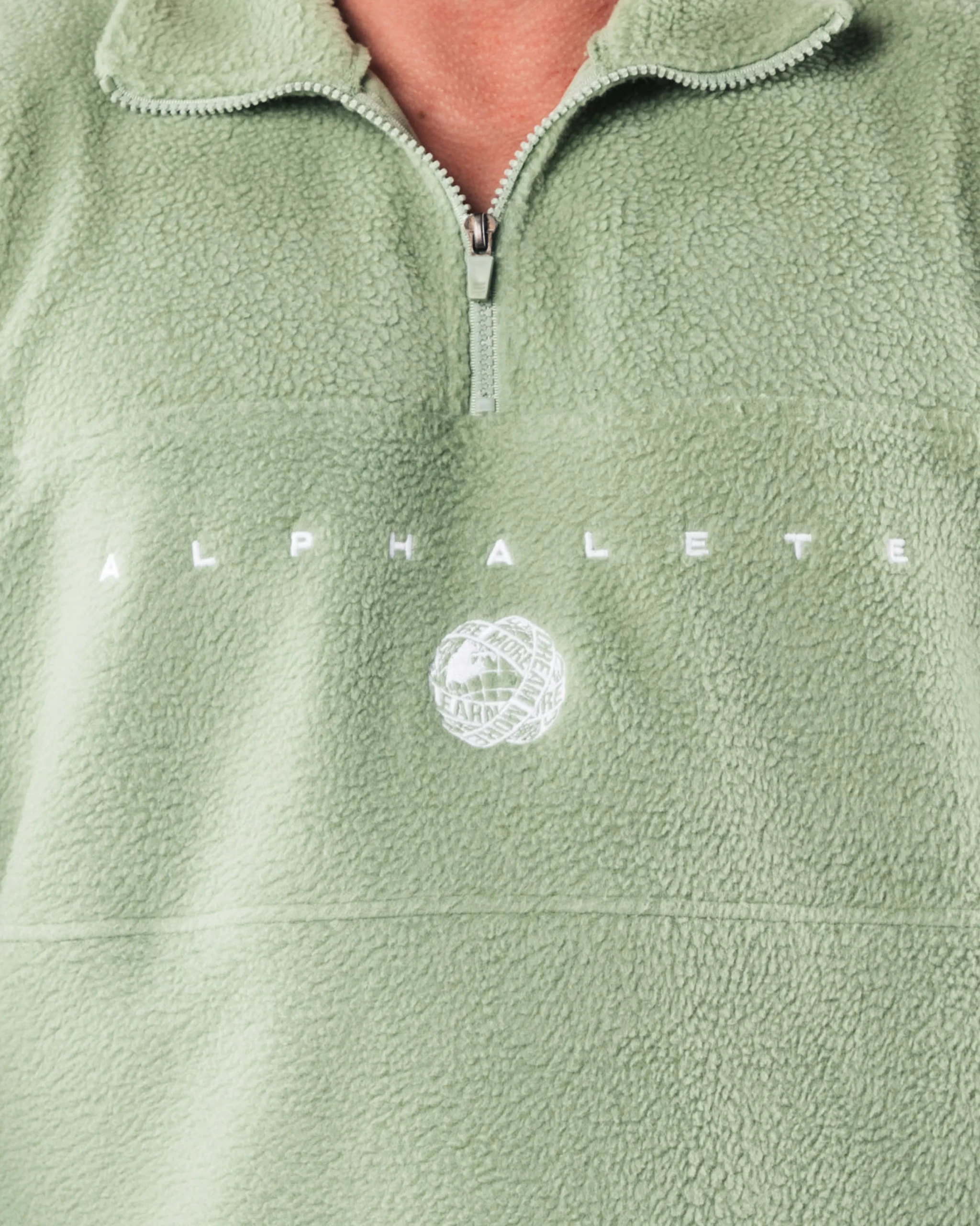 |HIGHLIGHTS|Mock neck collar|Quarter zip closure|Textured and plush fleece fabric|Embroidered Alphalete Classic + Globe logo on the center|FIT SUGGESTION|This item runs true to Alphalete’srelaxedfit.|If you are between sizes, we recommend sizing up.|Male model is 6’1”/185.4cm, wearing a size XL with a 44”/112cm chest.|Female model is 5’4″/162.5cm, wearing a size XS with a 33″/84cm bust.|MATERIALS AND WASHING DIRECTIONS|100%|Polyester|We recommend washing inside-out on a cold setting|Hang to dry|Introducing the King Collection: the epitome of coziness and versatility. Each piece is meticulouslycrafted to offer unrivaled comfort and functionality. Our signature textured fleece fabric envelops youin a soft, warm embrace, while the thoughtfully designed fit and neutral spring color palette cater toyour every need. The King Collection strikes the perfect balance between style and practicality,making these pieces indispensable in your wardrobe.