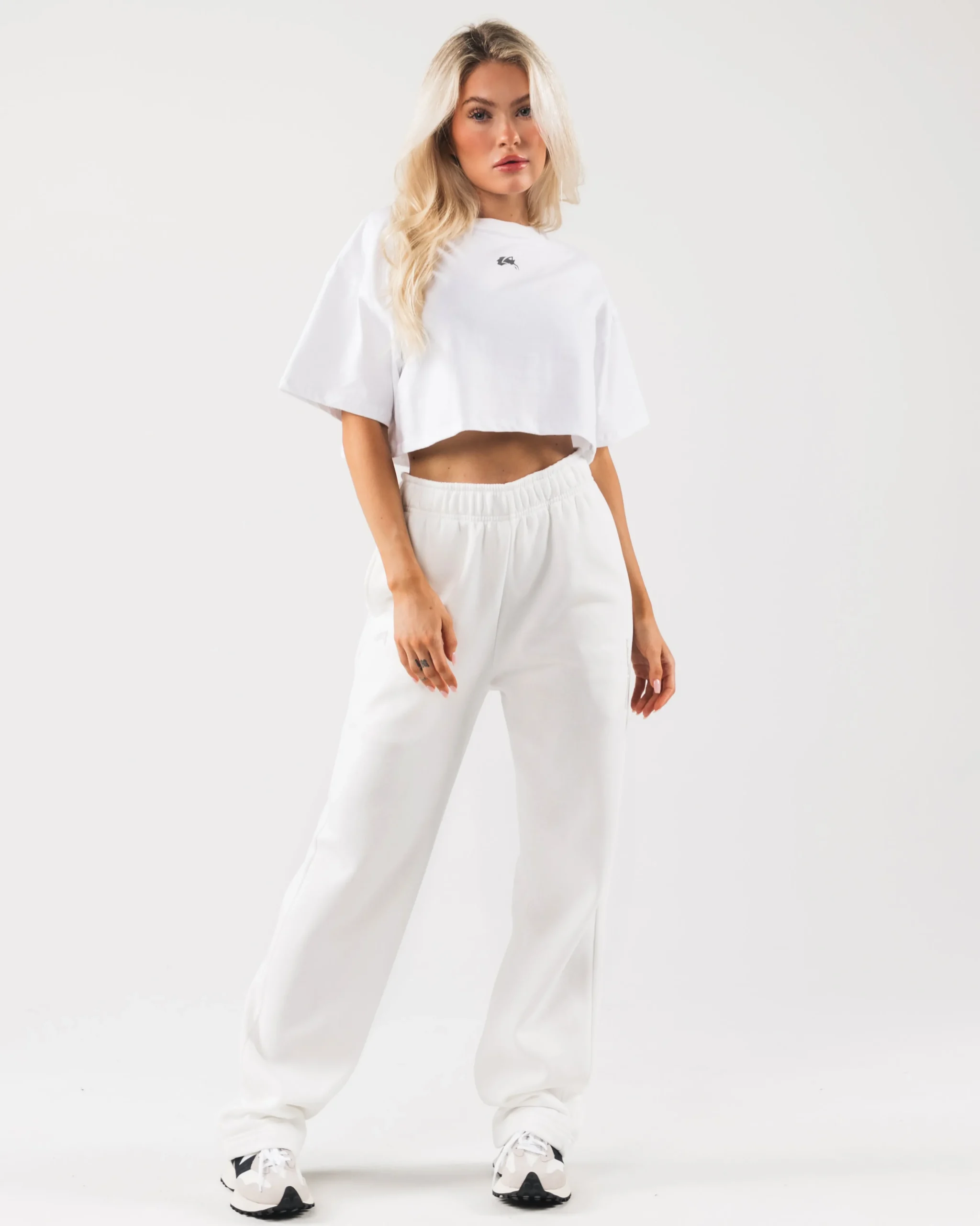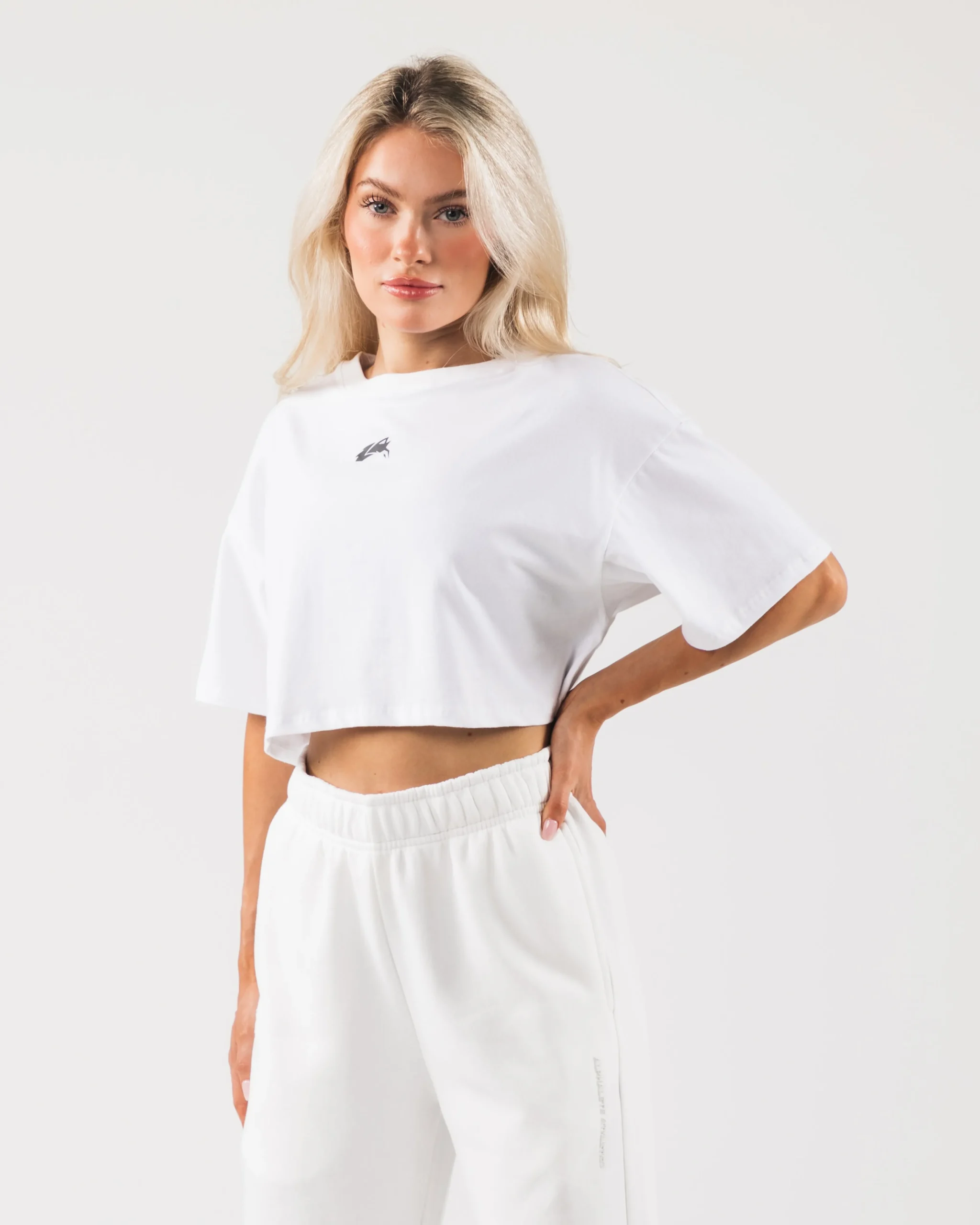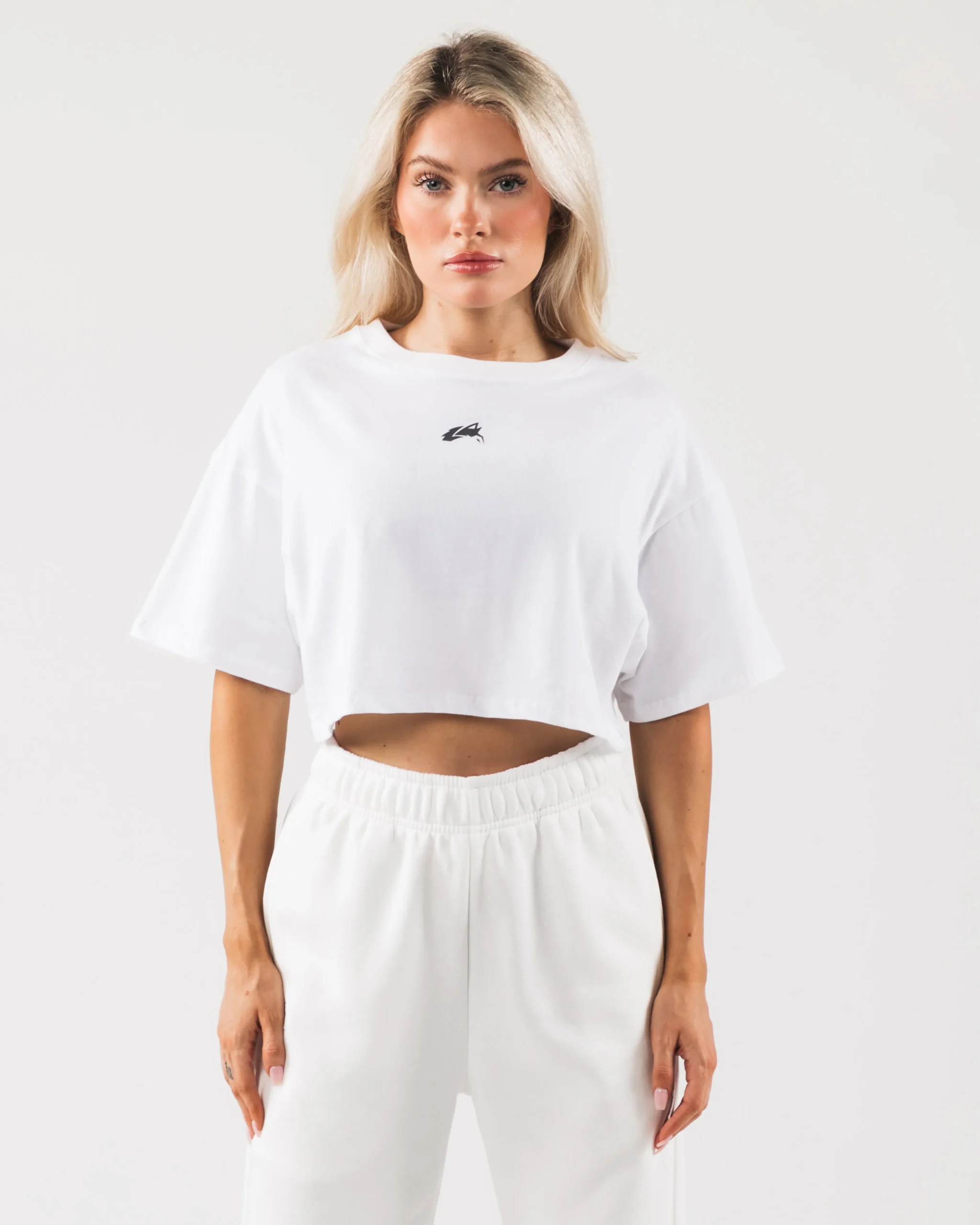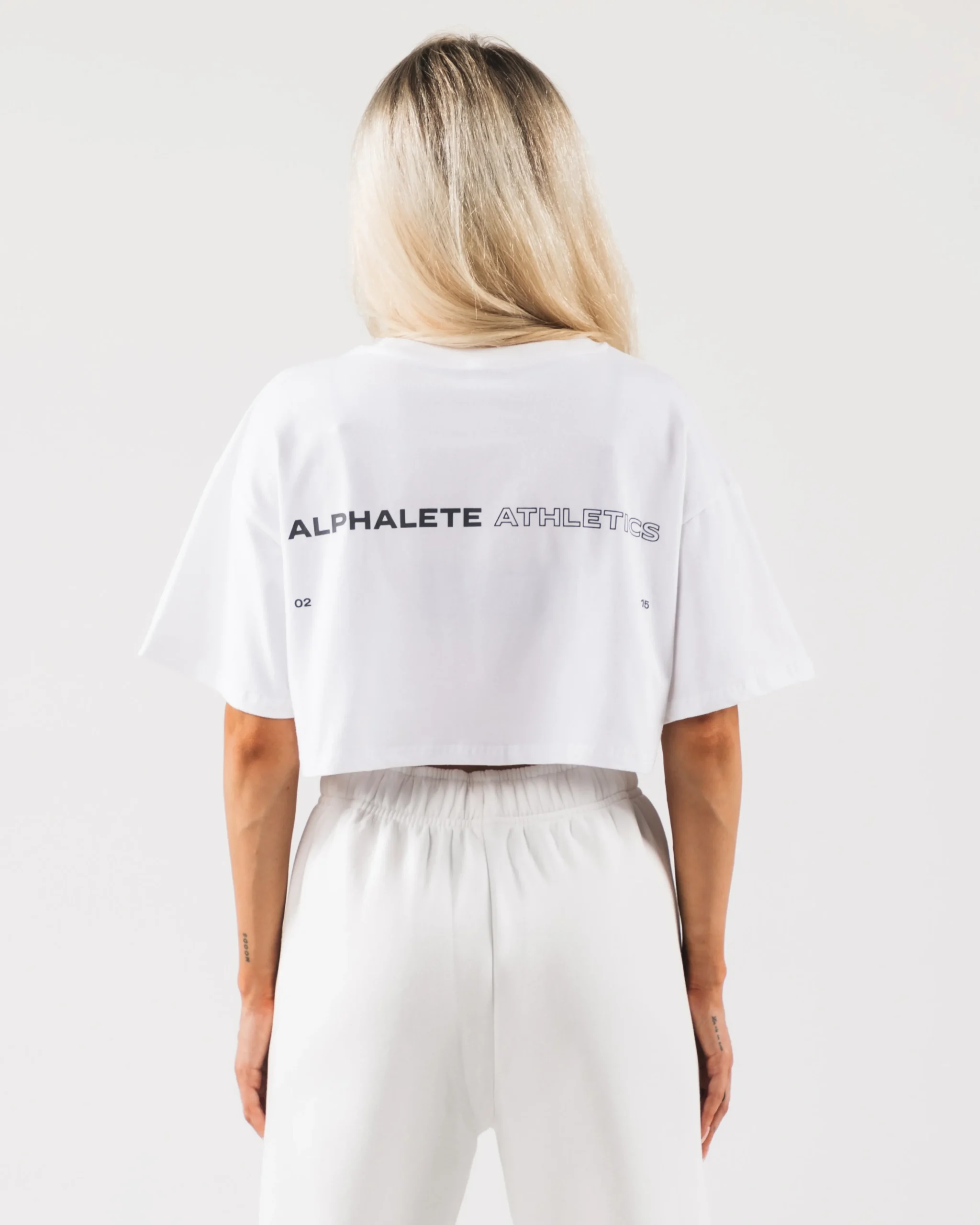 |HIGHLIGHTS|Relaxed fit|Cropped|Lightweight u0026amp; flexible|FIT SUGGESTION|This item runs true to Alphalete’s standard fit.|Model is 5’2”/157.5cm, wearing a size S with a 34”/86.4cm bust.|MATERIALS AND WASHING DIRECTIONS|95%Cotton,5%Spandex|We recommend washing inside-out on a cold setting|Hang to dry|DESCRIPTION|The perfect merge of style and performance, this tee is durable and comfortable. The Origin Crop Tee features our signature wolf head and Alphalete Athletics logo. Mix and match with out collection for the perfect workout outfit.