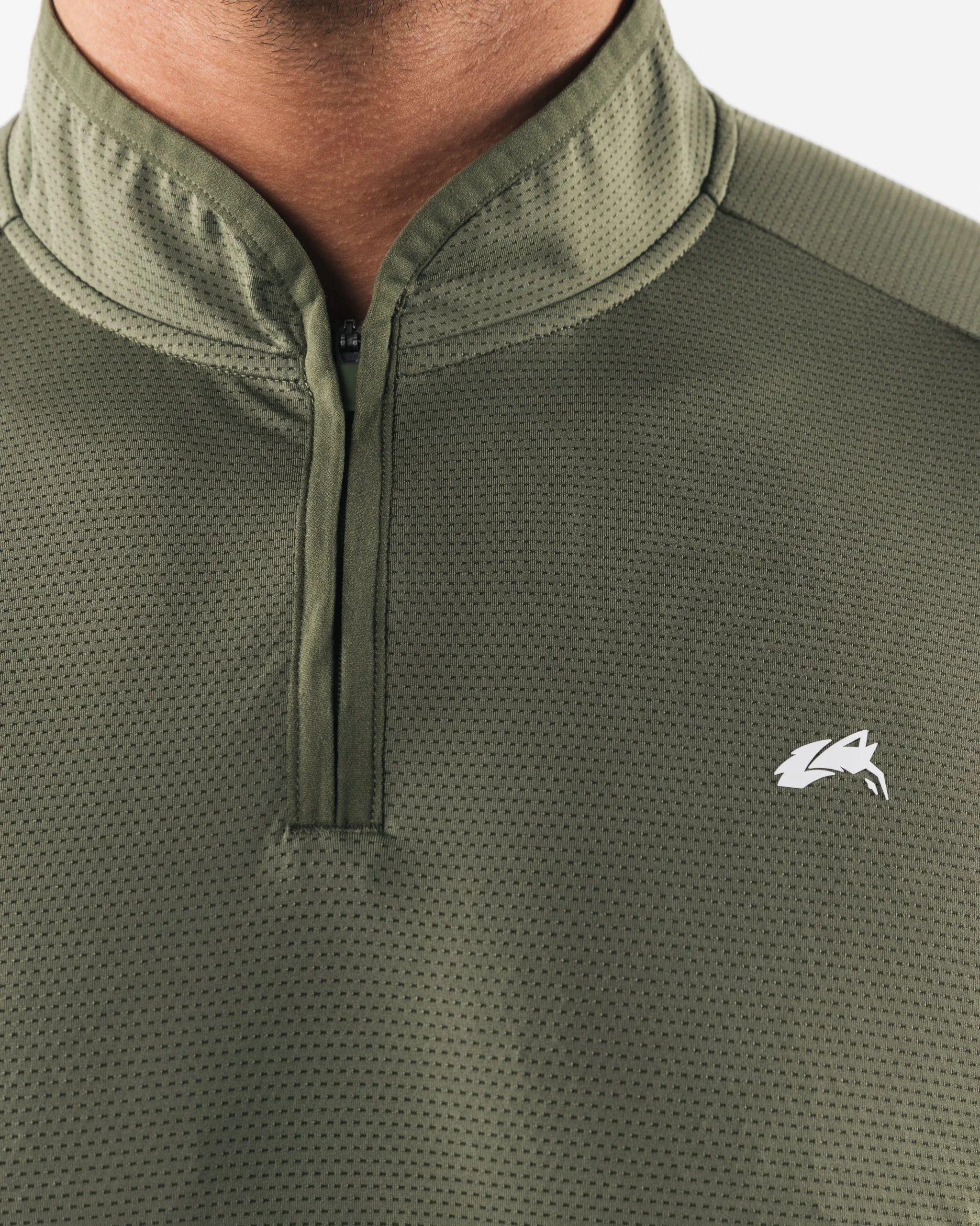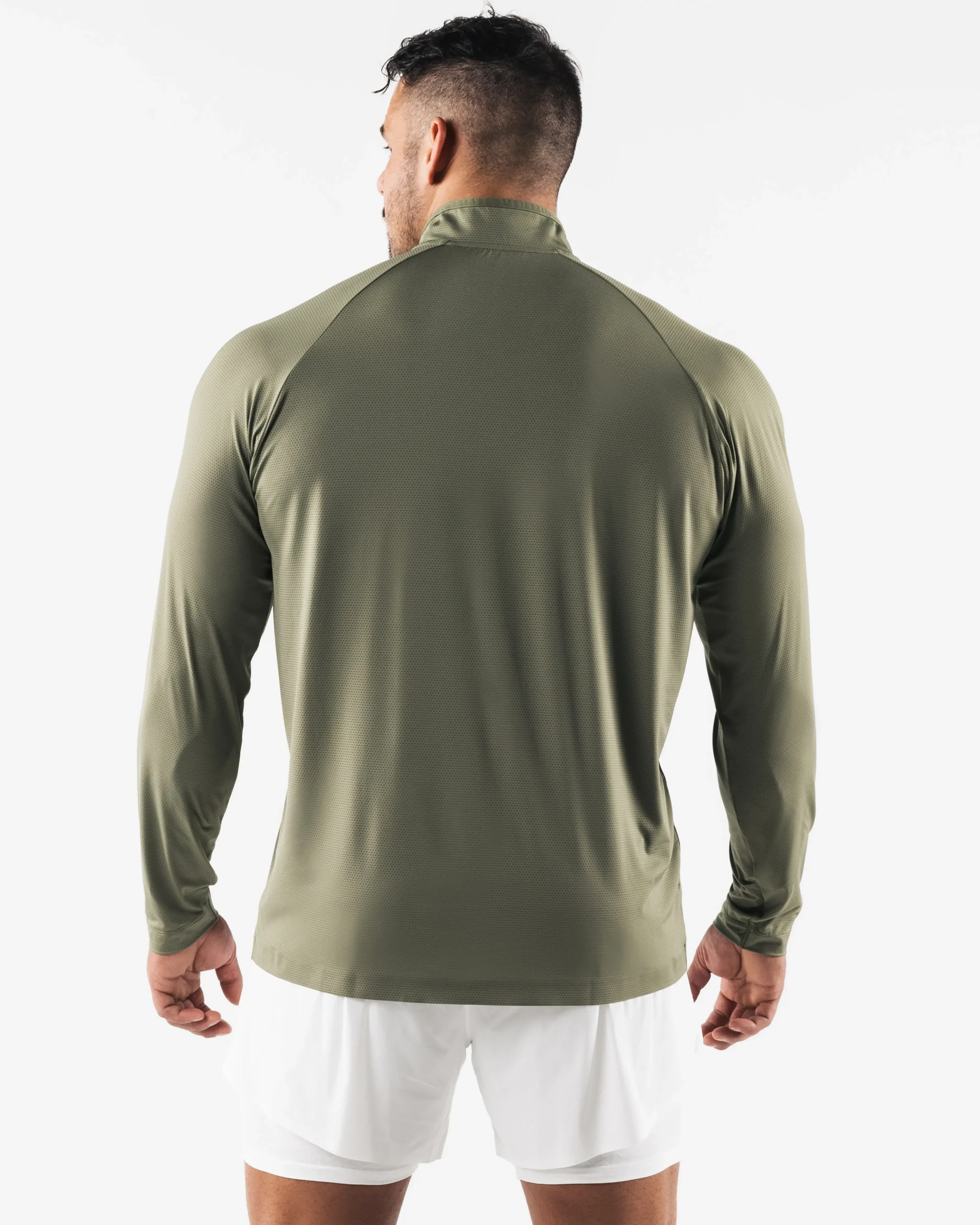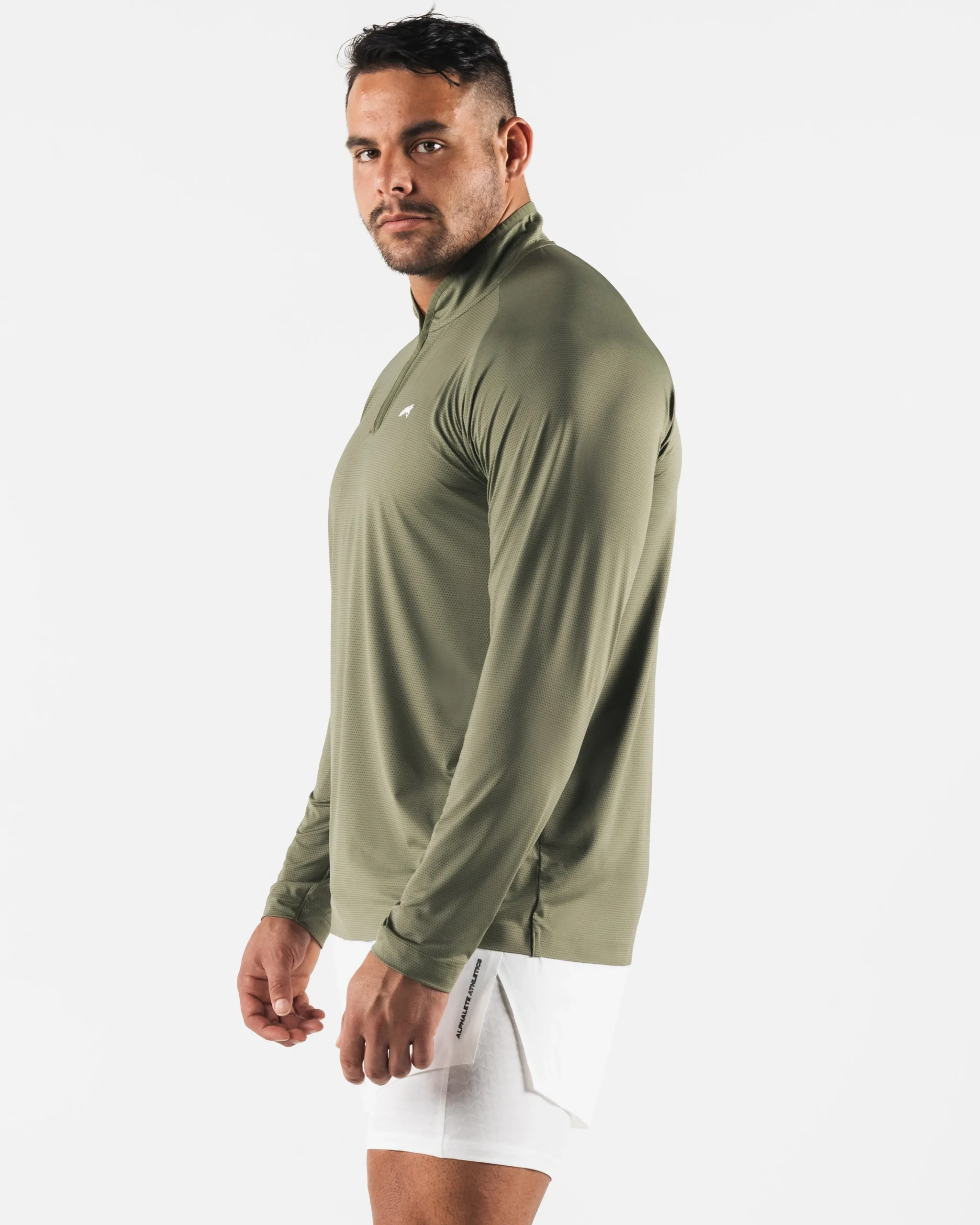 |HIGHLIGHTS|Bonded finish at hem|Lightweight and breathable mesh knit fabric|Four way stretch|Zip placket with notched collar|Logo aplique at front chest|FIT SUGGESTION|This item has a slim fit.|Narrower cut, tapered waist, fitted appearance.|Jammal is6’0”/183cm, wearing a size XL with a 51”/130cm chest.|MATERIALS AND WASHING DIRECTIONS|84% Nylon, 16% Elastane|Mobility|Lightweight|Four way stretch|Breathability|Cold wash|Do not iron|Do not tumble dry|Do not bleach|Inspired by running Alphalete distills the fundamentals of form, function and comfort for optimal movability. The racer quarter zip is constructed from a lightweight mesh fabric which offers breathability and flexibility. Notched collar, a bonded hem and four way stretch fabric all offer movement without restriction to serve you on your fitness journey.|