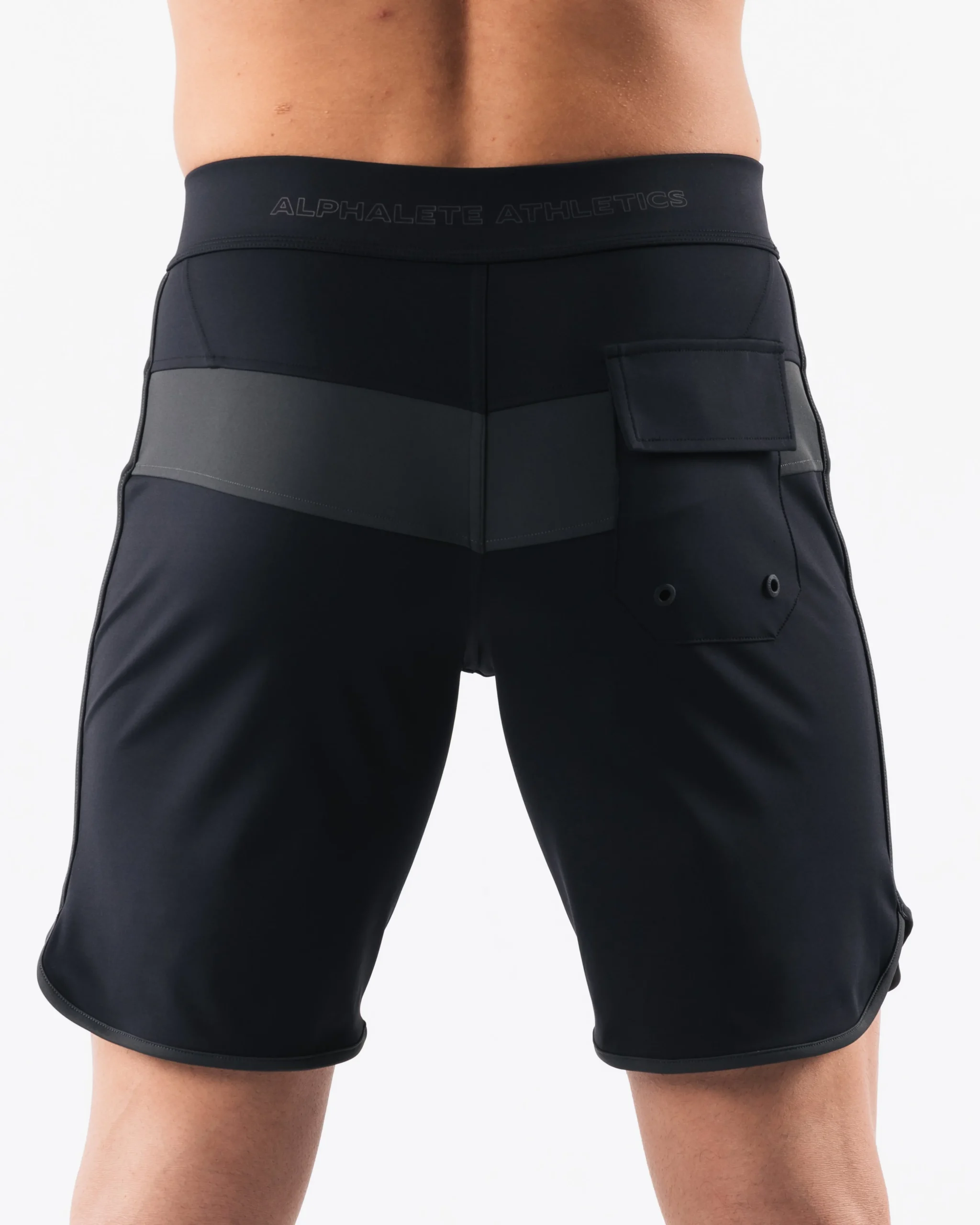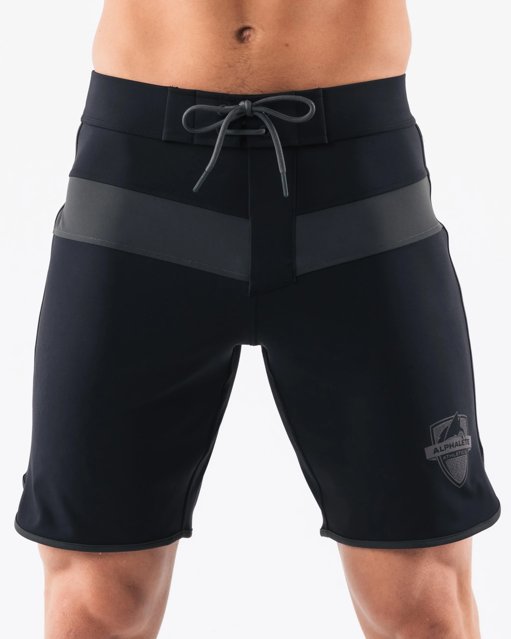 HIGHLIGHTS|Unlined boardshort|9” inseam|Reflective branding at leg opening and back waistband|Elastic waistband with adjustable self-tie drawcords|Color-blocking panelling|Water resistant fabric|FIT SUGGESTION|This item runs true to Alphalete’s standard sizing.|Fit is based off of waist size in inches.|If you are between sizes, we recommend sizing up for a relaxed fit.|Eric is 6’2”/188cm, wearing a size 32.|MATERIALS AND WASHING DIRECTIONS|67% Nylon, 23% spandex|Due to the high saturation of colors, initial fabric bleed may occur|We recommend washing inside-out on a cold setting|Hang to dry|DESCRIPTION|Our Titan Short is a testament to strength and resilience. Just like the mighty Titans of ancient mythology,these shorts are designed to empowerand inspire. Crafted with durability andcompetition in mind.|