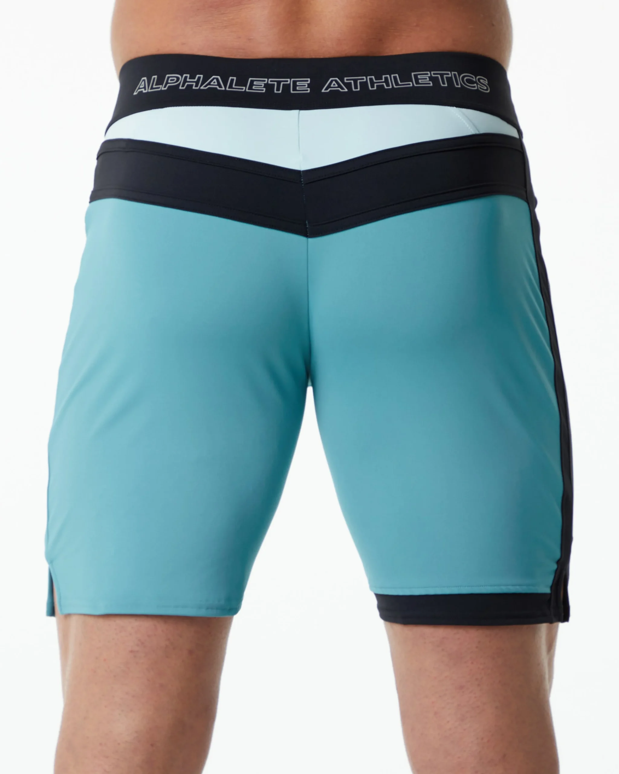 |HIGHLIGHTS|Water resistant fabric|Unlined board short|9” inseam|Soft touch rubber tags|Elastic waistband with adjustable tie drawstring|Color-blocking contrast paneling|Reflective competition logo badge print|FIT SUGGESTION|This item runs true to Alphalete’s standard sizing.|Fit is based off of waist size in inches.|If you are between sizes, we recommend sizing up for a relaxed fit.|Model is 6’0”/183cm, wearing a size 31.|MATERIALS AND WASHING DIRECTIONS|67% Nylon, 23% spandex|Due to the high saturation of colors, initial fabric bleed may occur|We recommend washing inside-out on a cold setting|Hang to dry|DESCRIPTION|Moisture reactive fabric in our Board Short collection helps the garments to perform both in and out of the water. With a water repellent finish that encourages quick-drying and extends the life of the shorts, these bottoms are both incredibly durable and breathable. The high stretch, knit material allows for total flexibility that molds to your body while offering a soft and comfortable fit. Designed with an elastic waistband, an adjustable drawcord and a curved curved leg opening that enhances the wearer’s physique. Featuring custom reflective branding, soft-touch rubber tags and contrast paneling throughout. Our Board Shorts are the ultimate piece to elevate your swim and competition wardrobe.